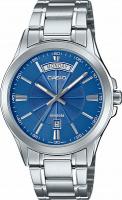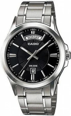 Мужские кварцевые часы в корпусе из нержавеющей стали с синим циферблатом. Модель оснащена центральными стрелками и удобным окном с отображением даты и дня недели. Прочное минеральное стекло и водостойкость 50 метров (WR 50) защищают от брызг, дождя и мелких повреждений. Стальной браслет с раскладывающейся застежкой обеспечивает комфортную посадку. Вес модели — 104 грамма, срок службы батарейки — до 3 лет.