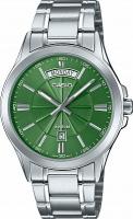 Мужские кварцевые часы в корпусе из нержавеющей стали с зеленым циферблатом. Модель оснащена центральными стрелками и удобным окном с отображением даты и дня недели. Прочное минеральное стекло и водостойкость 50 метров (WR 50) защищают от брызг, дождя и мелких повреждений. Стальной браслет с раскладывающейся застежкой обеспечивает комфортную посадку. Вес модели — 104 грамма, срок службы батарейки — до 3 лет.