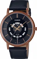 Мужские наручные часы Casio Collection MTP-B135RL-1A. Точный кварцевый механизм с аналоговой индикацией. Ремешок изготовлен из кожи. Аккумулятор обеспечивает часы достаточным питанием приблизительно на 3 года. Браслет из нержавеющей стали. Прочное, устойчивое к царапинам минеральное стекло защищает часы от повреждений. На циферблате отображается текущее число месяца и день недели. Часы являются водонепроницаемыми до 5 Бар. Цвет циферблата: Розовое золото. Цвет корпуса: Черный. Толщина: 8 мм. Гарантия: 2 года.