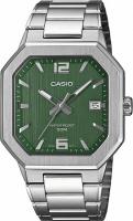 Мужские часы Casio MTP-B195D-3A — это классическая модель для повседневного и делового стиля, сочетающая лаконичный дизайн и проверенное японское качество. Часы подойдут тем, кто ищет универсальный аксессуар для офиса и повседневной носки. Модель оснащена кварцевым механизмом Casio калибра 5664, обеспечивающим точный и стабильный ход. На циферблате отображается текущая дата, что делает часы практичными для ежедневного использования. Корпус и браслет выполнены из нержавеющей стали, благодаря чему часы отличаются прочностью и устойчивостью к износу. Зелёный циферблат защищён минеральным стеклом, а стрелки покрыты люминесцентным напылением, позволяющим легко считывать время в условиях слабого освещения. Размер корпуса 38 x 46.5 x 8.3 мм (Ш x В xТ) делает модель аккуратной и комфортной на запястье. Водонепроницаемость 50 метров (5 АТМ/bar): выдерживают мытье рук, попадание крупных капель.