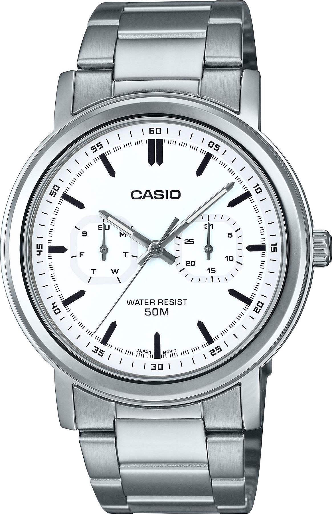 Мужские наручные часы Casio Collection MTP-E335D-7E. Точный кварцевый механизм с аналоговой индикацией. Браслет из нержавеющей стали. Аккумулятор обеспечивает часы достаточным питанием приблизительно на 3 года. Браслет из нержавеющей стали. Прочное, устойчивое к царапинам минеральное стекло защищает часы от повреждений. Часы являются водонепроницаемыми до 5 Бар. Цвет циферблата: Серебристый. Цвет корпуса: Белый. Высота (с ушками): 48 мм. Толщина: 9 мм. Гарантия: 2 года.