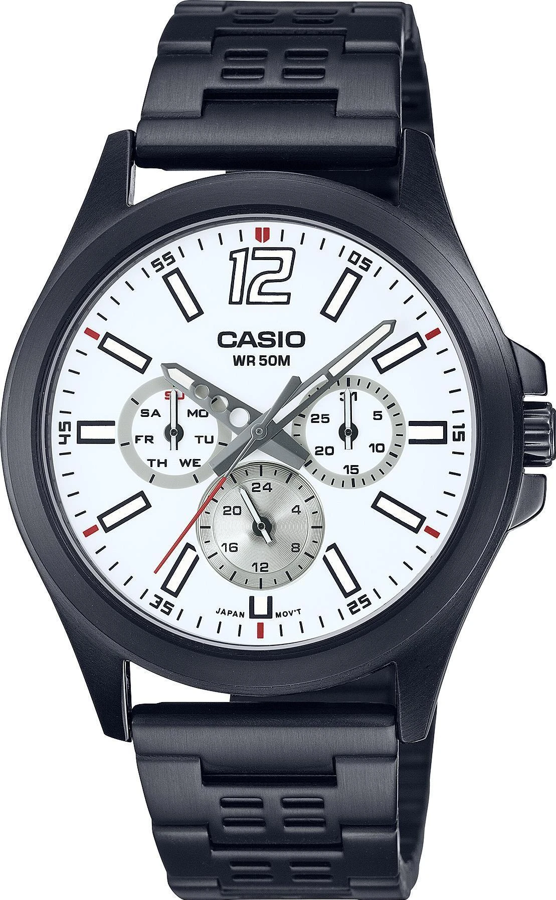 Мужские наручные часы Casio Collection MTP-E350B-7B. Точный кварцевый механизм с аналоговой индикацией. Браслет из нержавеющей стали. Отображение времени возможно в 12-часовом или 24-часовом формате. Аккумулятор обеспечивает часы достаточным питанием приблизительно на 3 года. Браслет из нержавеющей стали. Прочное, устойчивое к царапинам минеральное стекло защищает часы от повреждений. На циферблате отображается текущее число месяца и день недели. Часы являются водонепроницаемыми до 5 Бар. Цвет циферблата: Черный. Цвет корпуса: Белый. На стрелки и отметки нанесен светонакопительный состав, благодаря этому считывать информацию с циферблата возможно и в темноте. Толщина: 9 мм. Гарантия: 2 года.