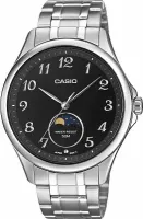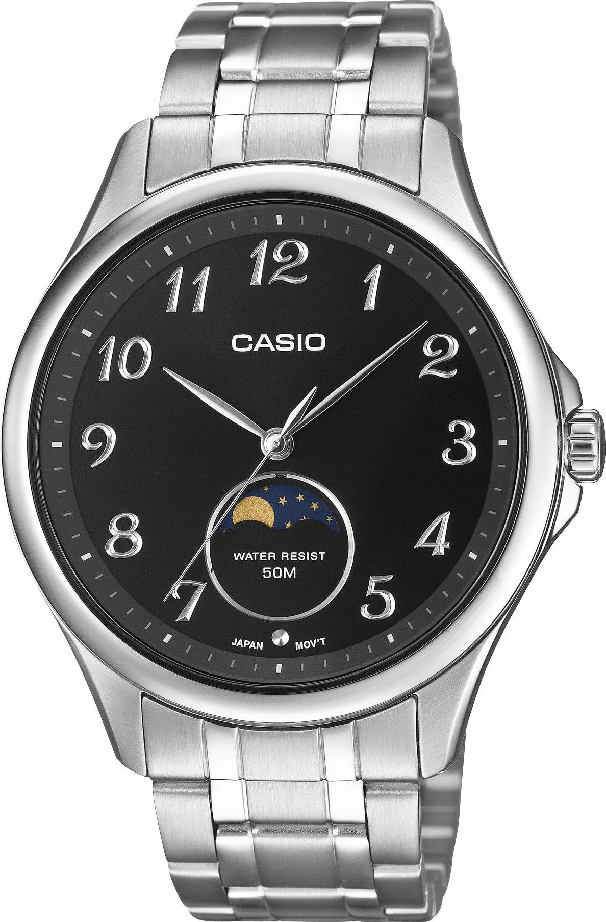 Классические мужские наручные часы с аналоговой индикацией времени, кварцевый механизм с тремя стрелками и питанием от батарейки, черный циферблат, рельефные арабские цифры, полированные стрелки и цифры, указатель фаз Луны, прочный корпус и безель из нержавеющей стали, защищенная заводная головка, завинчивающаяся задняя крышка, устойчивое к царапинам минеральное стекло, интегрированный матовый браслет из нержавеющей стали с полированными полосами, предохранительная раскладывающаяся застежка с выгравированным логотипом, водонепроницаемость до 5 бар, размеры 48,4 x 42,5 x 9,6 мм (Д x Ш x В).