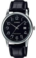 Мужские наручные кварцевые часы в стальном корпусе круглой формы, секундная стрелка центральная, окошко даты в положении 3 часа, на кожаном ремешке черного цвета.