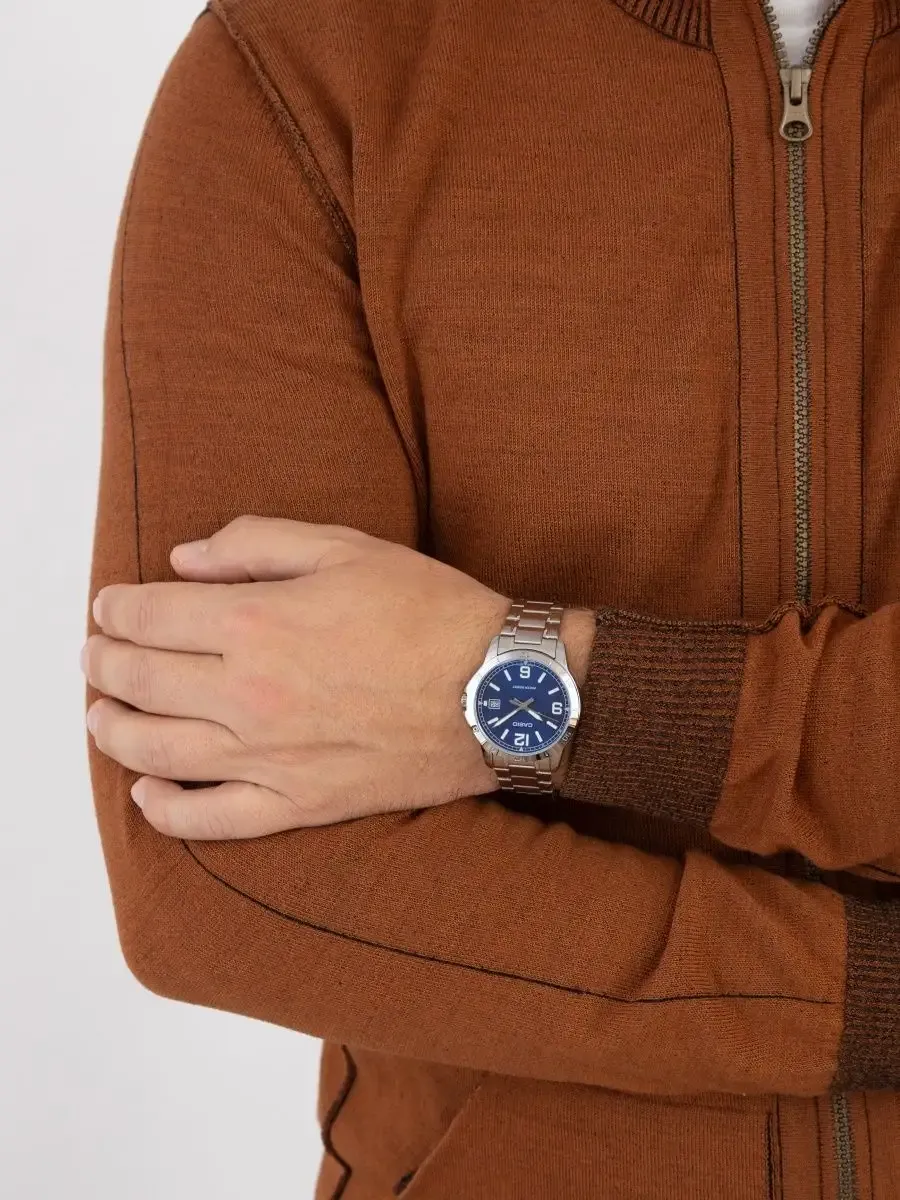 Мужские наручные часы Casio Collection MTP-V004D-2B. Точный кварцевый механизм с аналоговой индикацией. Корпус изготовлен из высококачественной нержавеющей стали 316L с высокими антикоррозийными свойствами. На стрелки и отметки нанесен светонакопительный состав, благодаря этому считывать информацию с циферблата возможно и в темноте. На циферблате отображается текущее число месяца. Браслет из нержавеющей стали. Прочное, устойчивое к царапинам минеральное стекло защищает часы от повреждений. Часы являются водонепроницаемыми до 3 Бар. Цвет корпуса: Серебристый. Цвет циферблата: Синий. Ширина (с заводной головкой): 42мм. Толщина: 10мм. Гарантия: 2 года.
