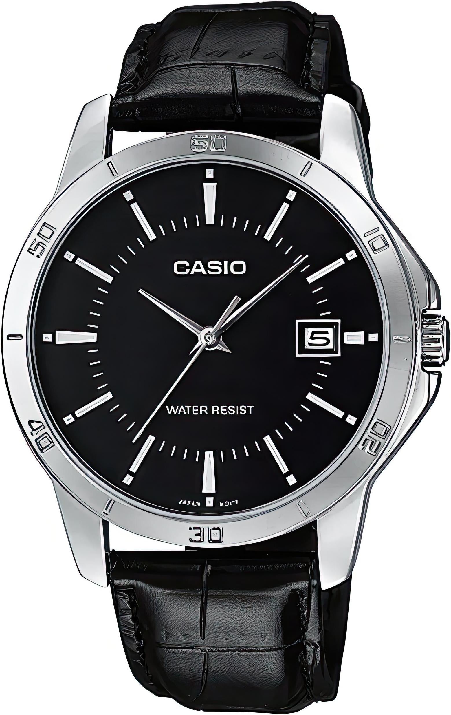 Мужские наручные часы с окошком даты и центральной секундной стрелкой в стальном круглом корпусе, вместо цифр риски на черном циферблате. На черном кожаном ремешке.