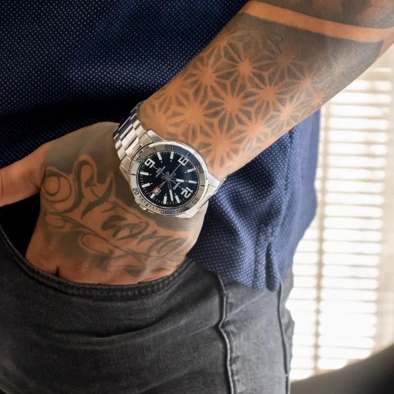 • Циферблат выполнен в спортивном стиле, большие часовые метки «дайвер».