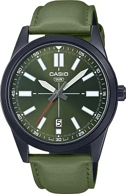 <b>Мужские наручные часы Casio Collection MTP-VD02BL-3E.</b> Точный кварцевый механизм с аналоговой индикацией. Корпус изготовлен из высококачественной нержавеющей стали 316L с высокими антикоррозийными свойствами. На стрелки и отметки нанесен светонакопительный состав, благодаря этому считывать информацию с циферблата возможно и в темноте. На циферблате отображается текущее число месяца. Аккумулятор обеспечивает часы достаточным питанием приблизительно на 3 года. Ремешок изготовлен из кожи. Прочное, устойчивое к царапинам минеральное стекло защищает часы от повреждений. Часы являются водонепроницаемыми до 3 Бар. Цвет корпуса: Черный. Цвет циферблата: Зеленый. Ширина (с заводной головкой): 48мм. Толщина: 10мм. Гарантия: 2 года.