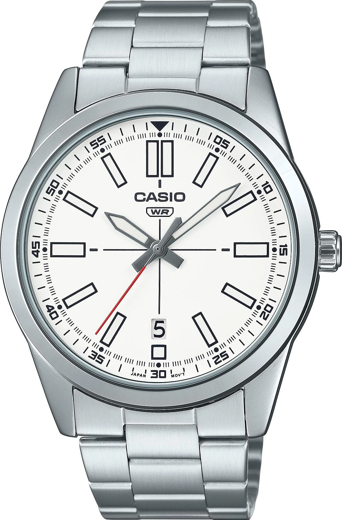 Мужские наручные часы Casio Collection MTP-VD02D-7E. Точный кварцевый механизм с аналоговой индикацией. Корпус изготовлен из высококачественной часовой латуни с высокими антикоррозийными свойствами. На стрелки и отметки нанесен светонакопительный состав, благодаря этому считывать информацию с циферблата возможно и в темноте. На циферблате отображается текущее число месяца. Аккумулятор обеспечивает часы достаточным питанием приблизительно на 3 года. Браслет из нержавеющей стали. Прочное, устойчивое к царапинам минеральное стекло защищает часы от повреждений. Часы являются водонепроницаемыми до 3 Бар. Цвет корпуса: Серебристый. Цвет циферблата: Белый. Ширина (с заводной головкой): 48мм. Толщина: 10мм. Гарантия: 2 года.