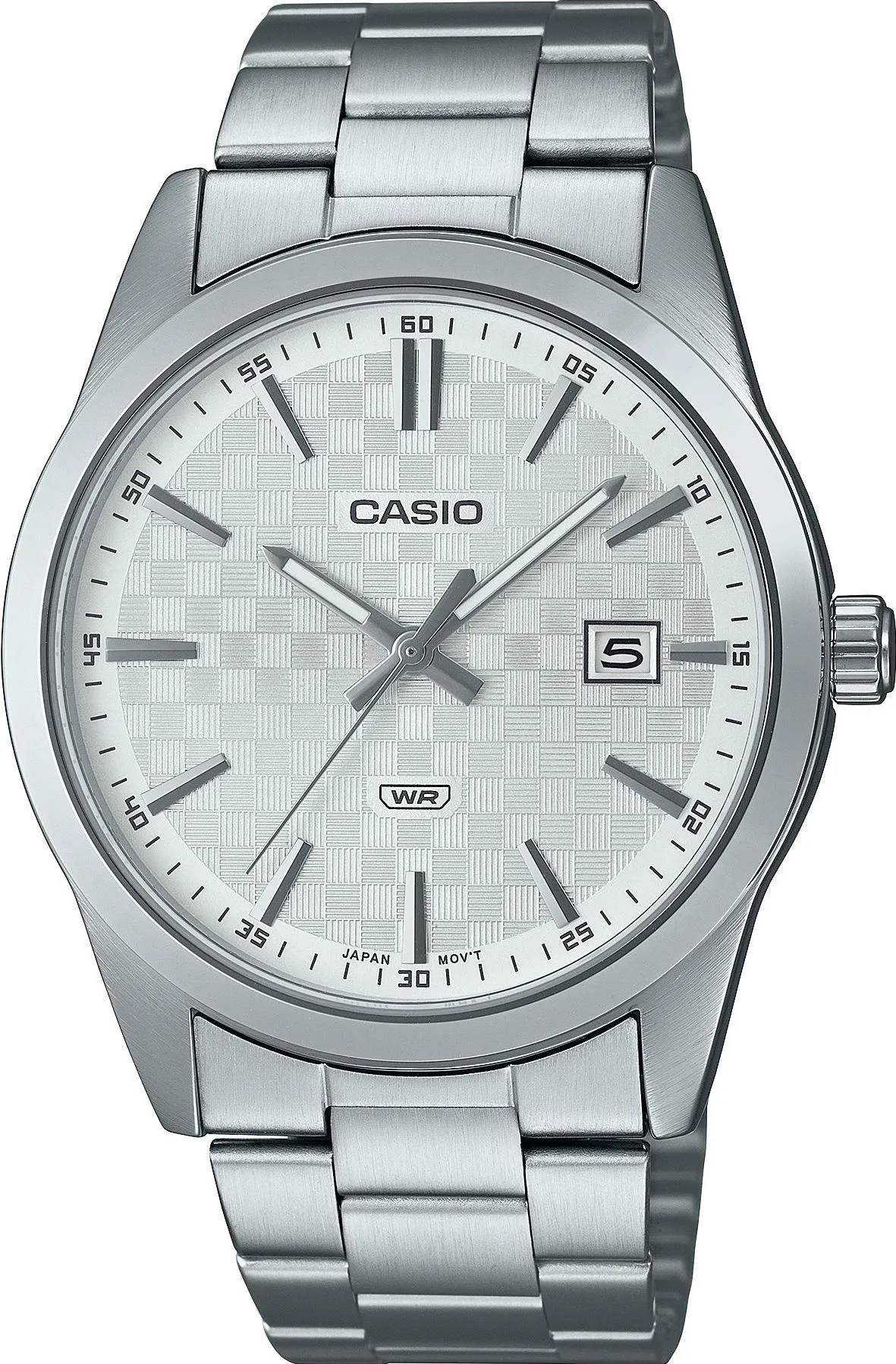 Мужские наручные часы Casio Collection MTP-VD03D-7A. Точный кварцевый механизм с аналоговой индикацией. В отличие от механических часов, не требуют завода и работают от батареи, показывая отклонение всего несколько секунд в месяц. На стрелки нанесен светонакопительный состав. Браслет из нержавеющей стали обладает высокой прочностью и износостойкостью, обеспечивая долговечность даже при активной эксплуатации. Материал устойчив к коррозии и сохраняет свой внешний вид надолго. Корпус изготовлен из высококачественной часовой латуни с высокими антикоррозийными свойствами. Прочное, устойчивое к царапинам минеральное стекло защищает часы от повреждений. Часы являются водонепроницаемыми до 3 Бар. Цвет циферблата: Серебристый. Высота (с ушками): 48 мм. Толщина: 9.6 мм. Гарантия: 2 года. Другие наименования модели: MTP-VD03D-7AUDF.