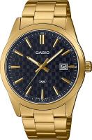 Мужские наручные часы Casio Collection MTP-VD03G-1A. Точный кварцевый механизм с аналоговой индикацией. В отличие от механических часов, не требуют завода и работают от батареи, показывая отклонение всего несколько секунд в месяц. На стрелки и отметки нанесен светонакопительный состав, благодаря этому считывать информацию с циферблата возможно и в темноте. Браслет из нержавеющей стали обладает высокой прочностью и износостойкостью, обеспечивая долговечность даже при активной эксплуатации. Материал устойчив к коррозии и сохраняет свой внешний вид надолго. Корпус изготовлен из высококачественной часовой латуни с высокими антикоррозийными свойствами. Прочное, устойчивое к царапинам минеральное стекло защищает часы от повреждений. Часы являются водонепроницаемыми до 3 Бар. Цвет корпуса: Желтое золото. Цвет циферблата: Черный. Высота (с ушками): 48 мм. Толщина: 9.6 мм. Гарантия: 2 года. Другие наименования модели: MTP-VD03G-1AUDF.