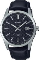 Мужские наручные часы Casio Collection MTP-VD03L-1A. Точный кварцевый механизм с аналоговой индикацией. В отличие от механических часов, не требуют завода и работают от батареи, показывая отклонение всего несколько секунд в месяц. На стрелки и отметки нанесен светонакопительный состав, благодаря этому считывать информацию с циферблата возможно и в темноте. Ремешок изготовлен из кожи. Гибкость такого ремешка позволяет точно регулировать посадку часов на руке. Корпус изготовлен из высококачественной часовой латуни с высокими антикоррозийными свойствами. Прочное, устойчивое к царапинам минеральное стекло защищает часы от повреждений. Часы являются водонепроницаемыми до 3 Бар. Цвет циферблата: Черный. Высота (с ушками): 48 мм. Толщина: 9.6 мм. Гарантия: 2 года. Другие наименования модели: MTP-VD03L-1AUDF.