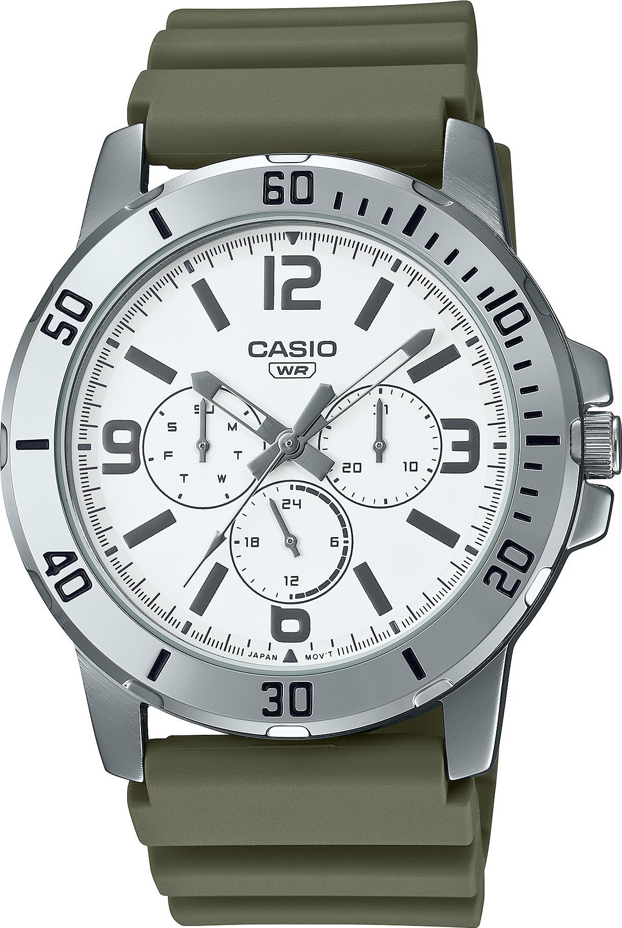 Мужские наручные часы Casio Collection MTP-VD300-3B. Точный кварцевый механизм с аналоговой индикацией. Полимерный ремешок. Натуральный полимерный материал является идеальным для изготовления ремешка благодаря своей чрезвычайной прочности и гибкости. Аккумулятор обеспечивает часы достаточным питанием приблизительно на 3 года. Браслет из нержавеющей стали. Прочное, устойчивое к царапинам минеральное стекло защищает часы от повреждений. На циферблате отображается текущее число месяца и день недели. Часы являются водонепроницаемыми до 3 Бар. Цвет циферблата: Серебристый. Цвет корпуса: Белый. Толщина: 9 мм. Гарантия: 2 года.