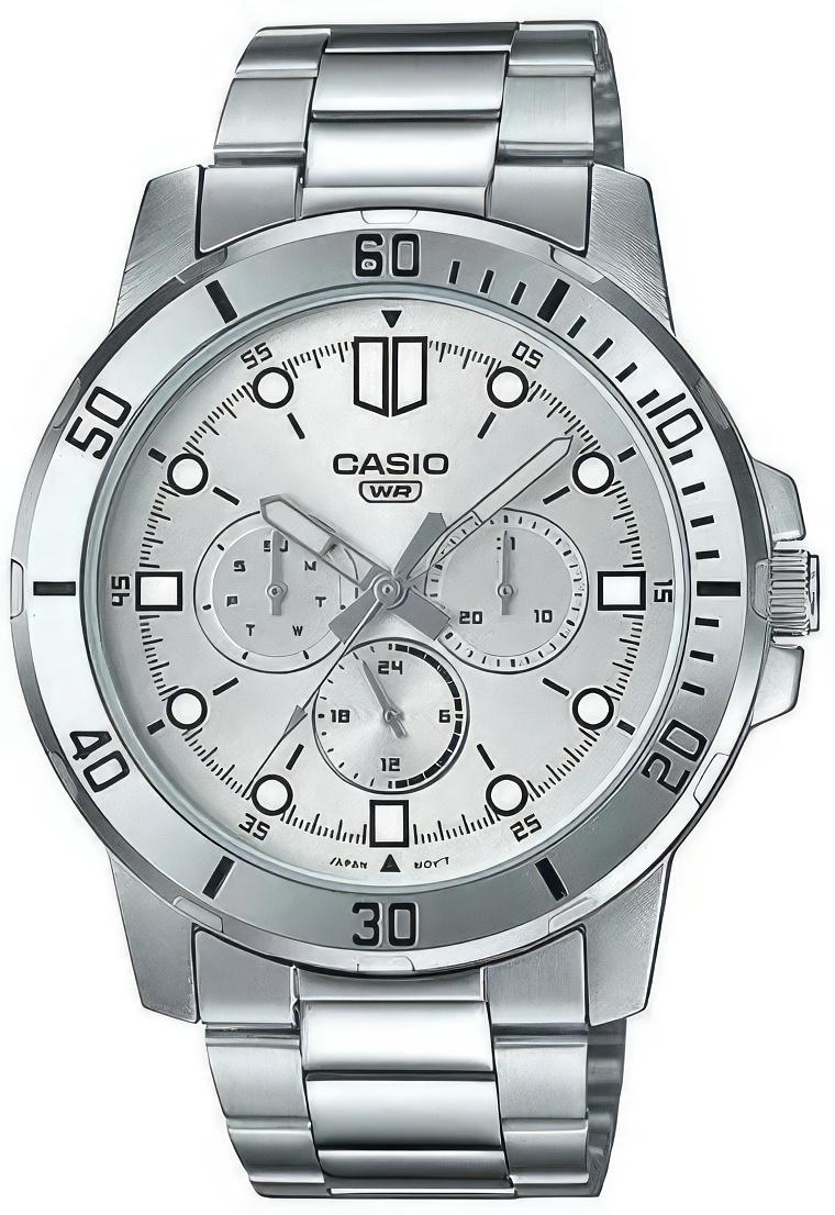 Мужские наручные часы Casio Collection MTP-VD300D-7E. Точный кварцевый механизм с аналоговой индикацией. Корпус изготовлен из высококачественной нержавеющей стали 316L с высокими антикоррозийными свойствами. На стрелки и отметки нанесен светонакопительный состав, благодаря этому считывать информацию с циферблата возможно и в темноте. На циферблате отображается текущее число месяца и день недели. Браслет из нержавеющей стали. Прочное, устойчивое к царапинам минеральное стекло защищает часы от повреждений. Часы являются водонепроницаемыми до 3 Бар. Цвет корпуса: Серебристый. Ширина (с заводной головкой): 42мм. Толщина: 10мм. Гарантия: 2 года.