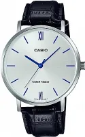 Мужские наручные часы. Японский кварцевый механизм. Серебристый циферблат. Минеральное стекло. Круглый стальной корпус с полированной поверхностью. Черный кожаный ремешок с тиснением. Индикация индексами и римскими цифрами синего цвета.