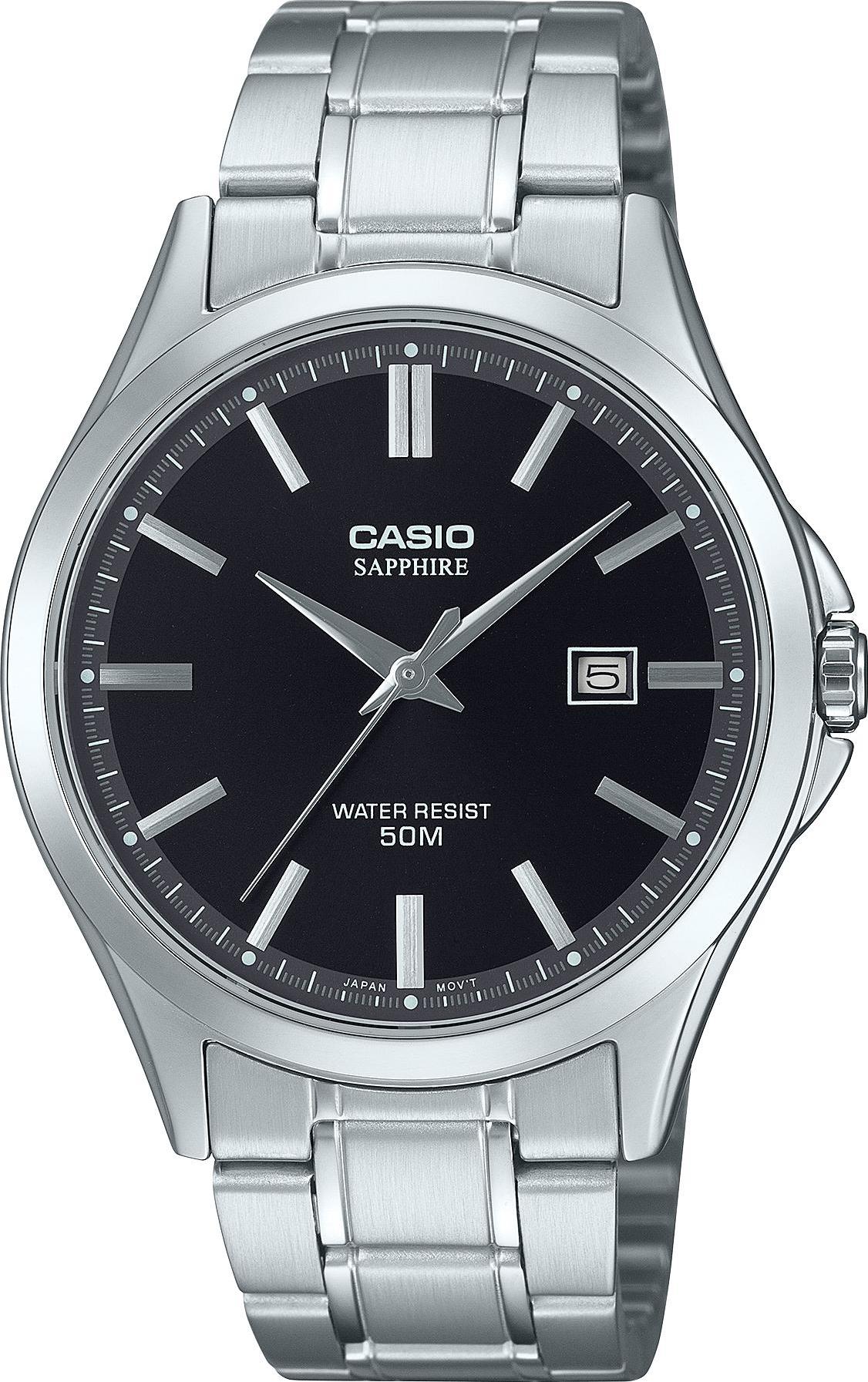 Мужские кварцевые часы с модулем 4393. Чёрный циферблат заключён в круглый корпус из нержавеющей стали размером 47?41,3?8,8 мм. Модель оснащена защищённой заводной головкой, стальным браслетом с раскладывающейся застёжкой и сапфировым стеклом, устойчивым к царапинам. Водостойкость WR 50 (5 атмосфер) позволяет не снимать часы при мытье рук и во время дождя. Вес изделия — 112 г. Батарейка рассчитана на 3 года службы.
