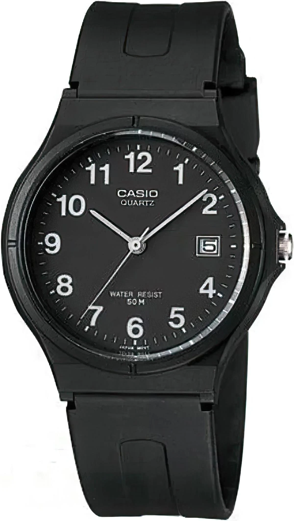 Мужские наручные часы с окошком даты и центральной секундной стрелкой в круглом пластиковом корпусе на резиновом ремешке.