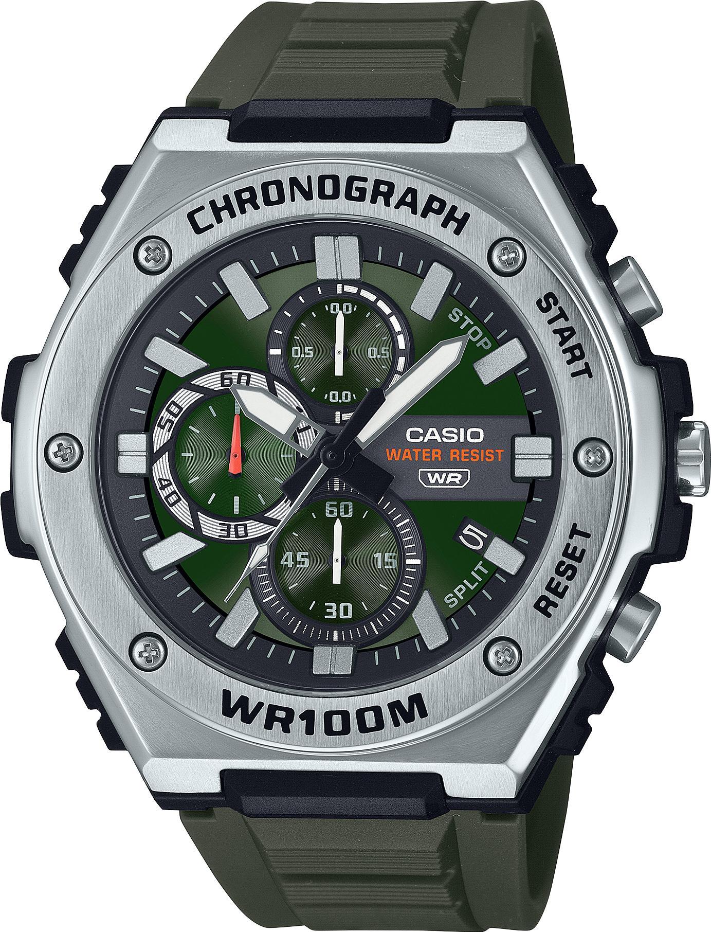 Мужские наручные часы Casio Collection MWA-300H-3A. Точный кварцевый механизм с аналоговой индикацией. Функция хронографа. Аккумулятор обеспечивает часы достаточным питанием приблизительно на 3 года. Органическое стекло. На циферблате отображается текущее число месяца. Часы являются водонепроницаемыми до 10 Бар. Цвет циферблата: Серебристый. Цвет циферблата: Черный. Цвет корпуса: Зеленый. Светодиодная подсветка. Толщина: 14.3 мм. Гарантия: 2 года.