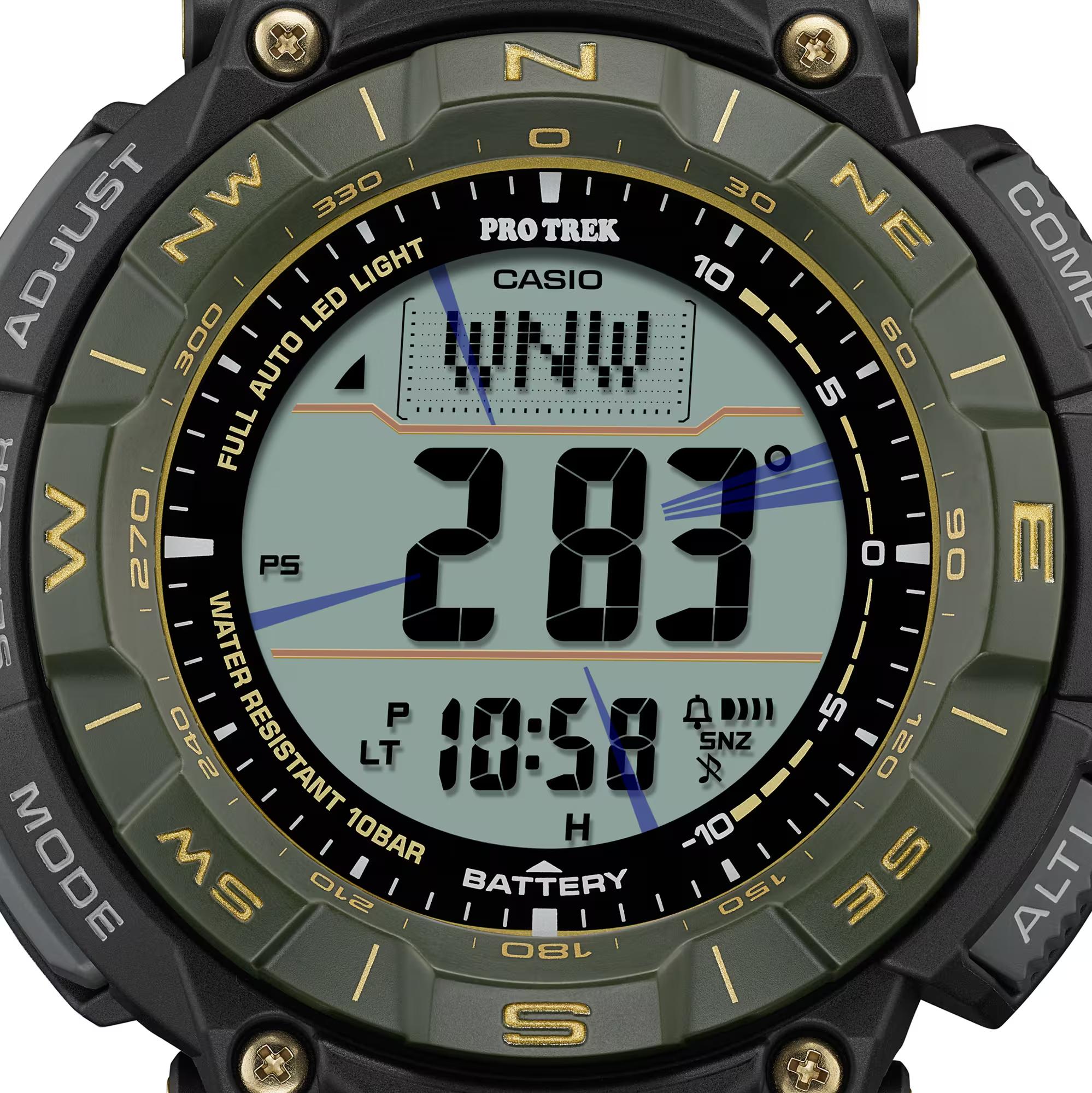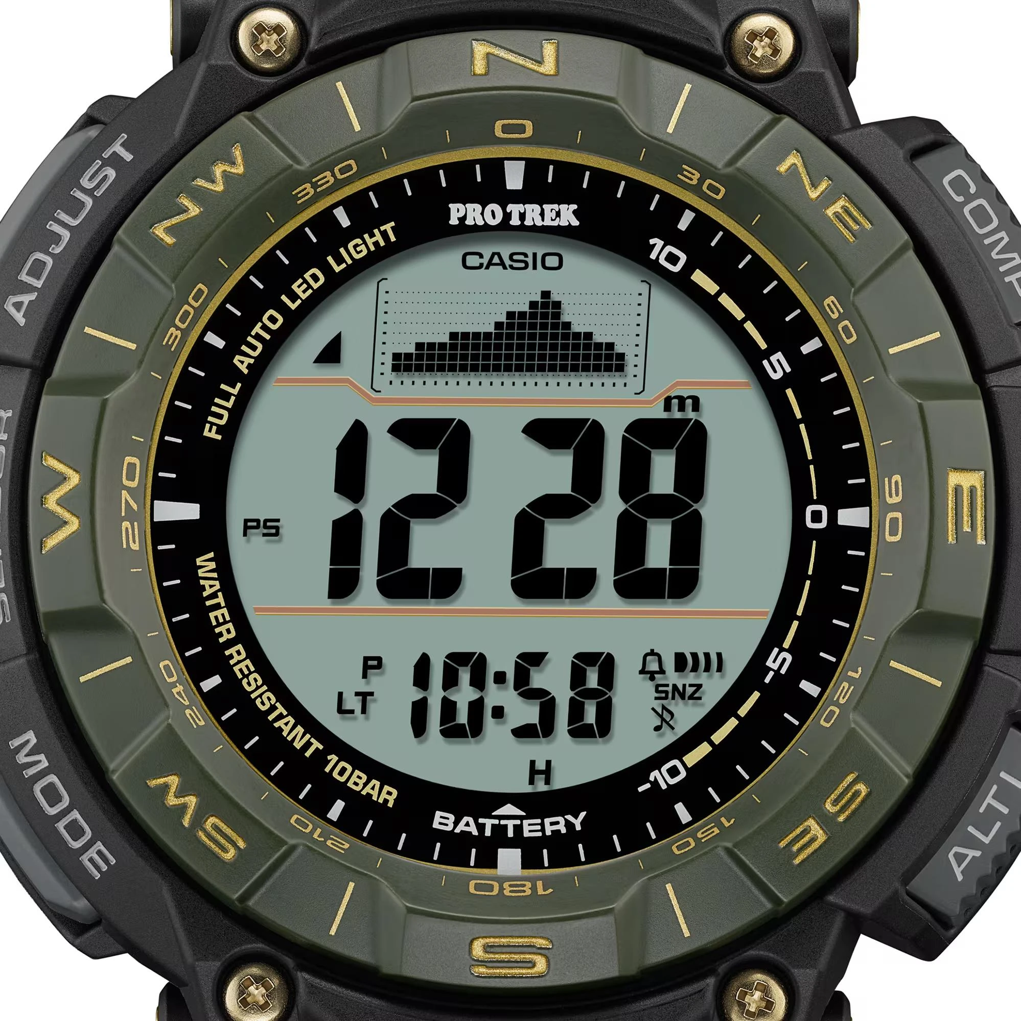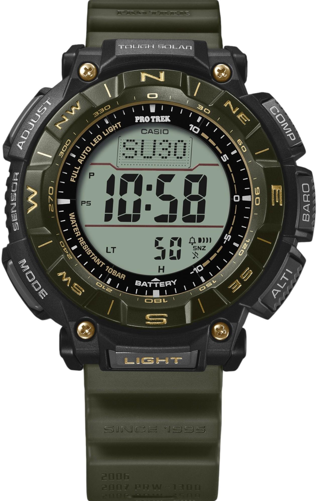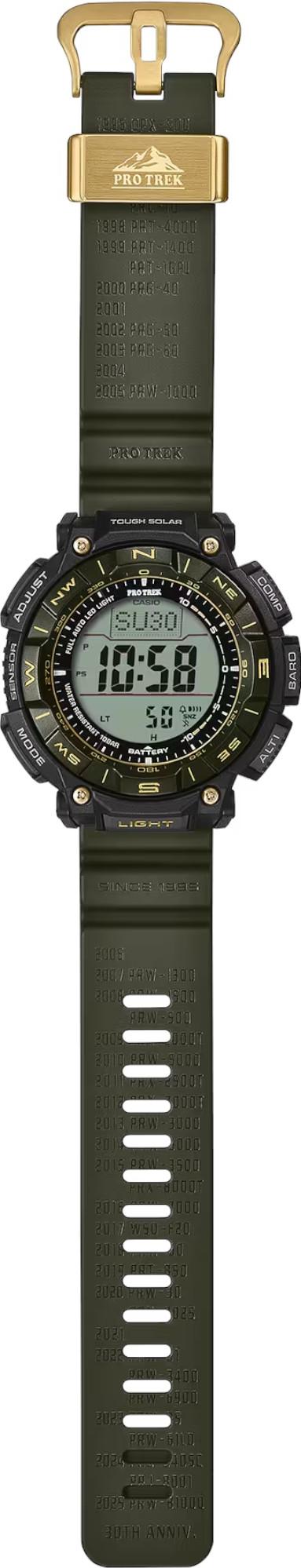 Редкий лимитированный релиз второй половины 2025 года — цифровые часы из серии PRG-340, выпущенные в честь 30-летия линейки часов Pro Trek. Выполнены в черном полимерном корпусе с ремешком и безелем цвета хаки, а металлические детали имеют золотой оттенок. Созданной цветовой гаммой дизайнеры Casio отсылают нас к лучам солнца, пробивающиеся сквозь лесные деревья, что отражает концепцию коллекции Pro Trek — «Единение с природой». На ремешке часов вы найдете перечень всех ключевых моделей протрек с годами их релиза за прошедшие 30 лет, на задней крышке — памятную юбилейную гравировку. Модель имеет функции: термометр, барометр, высотомер, компас и солнечная батарея, данные о заходе и восходе Солнца, автоматическая подсветка и еще более десятка часовых функций! Стоит отдельно отметить, что все полимерные материалы, использующиеся в часах, являются биопластиком, то есть созданы из возобновляемых органических ресурсов.