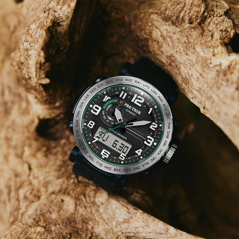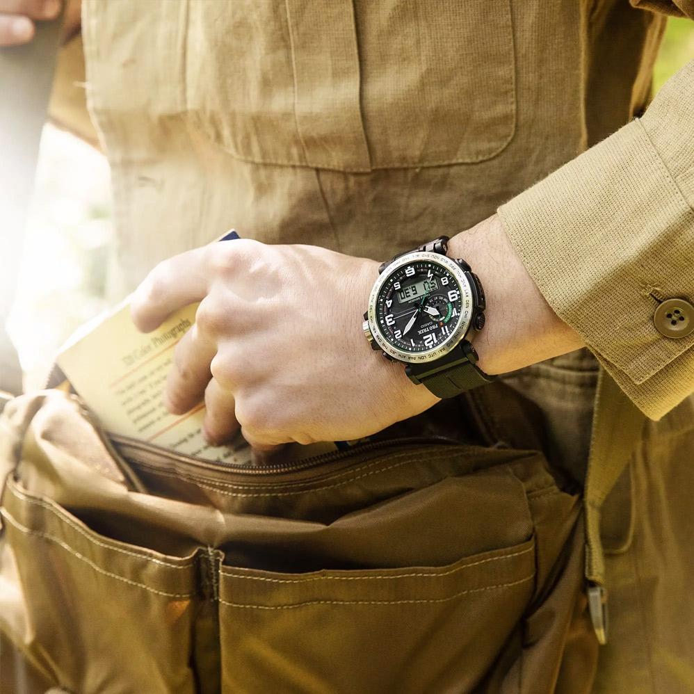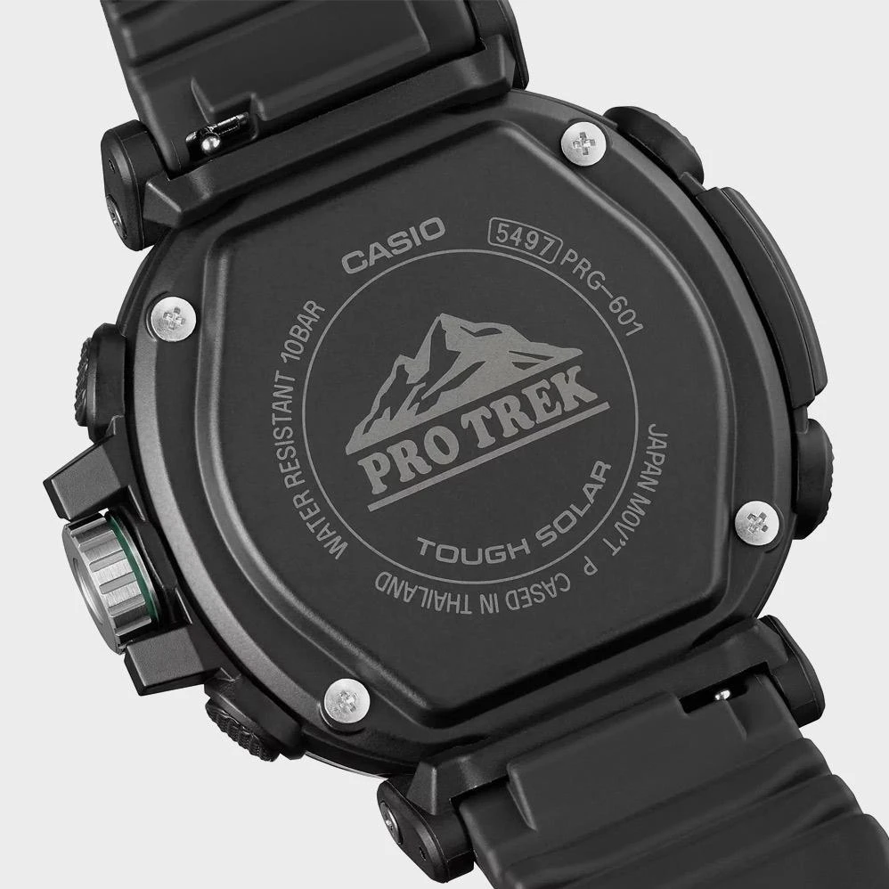 Мужские наручные часы Casio ProTrek PRG-601-1E. Точный кварцевый механизм с аналоговой индикацией. Корпус изготовлен из высококачественной нержавеющей стали 316L с высокими антикоррозийными свойствами. Светодиодная подсветка. На циферблате отображается текущее число, месяц и день недели. Ударопрочная конструкция часов защищает от ударов и вибрации. Солнечная батарейка. Солнечная подзаряжающаяся батарейка обеспечивает питание часов для работы. Встроенный цифровой компас определяет северный магнитный полюс. Термометр. Датчик измеряет температуру окружающего воздуха вокруг часов и отображает ее на экране в градусах. Высотомер (альтиметр). Встроенный датчик давления определяет изменения в атмосферном давлении и преобразовывает полученные результаты в абсолютную высоту. Специальный датчик измеряет давление воздуха и отображает измеренное значение на экране в виде символа. Это дает возможность заранее определить изменения погоды. Функция хронографа. Функция таймера. Таймеры обратного отсчета напомнят Вам о текущих или особенных событиях, издав звуковой сигнал в установленное время. Для подсветки дисплея используется светодиод, а так же имеет функцию автоматического включения подсветки, если Вы наклоните часы к своему лицу. Функция будильника. Индикатор запаса хода. Отображение текущего времени в основных городах и конкретных областях по всему миру. После настройки автоматический календарь всегда отображает точную дату. Отображение времени возможно в 12-часовом или 24-часовом формате. Полимерный ремешок. Натуральный полимерный материал является идеальным для изготовления ремешка благодаря своей чрезвычайной прочности и гибкости. Прочное, устойчивое к царапинам минеральное стекло защищает часы от повреждений. Часы являются водонепроницаемыми до 10 Бар. Цвет корпуса: Черный. Цвет циферблата: Черный. Ширина (с заводной головкой): 52мм. Толщина: 15мм. Гарантия: 2 года. Другие наименования модели: PRG-601-1.