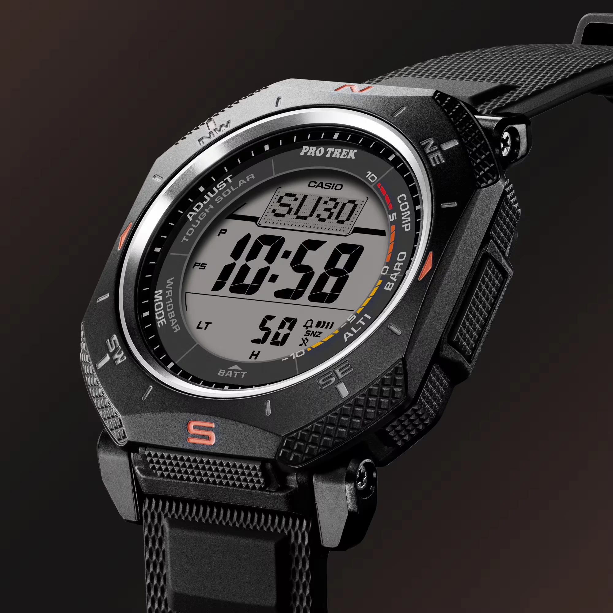 Главное преимущество модели — система Tough Solar, которая заряжает аккумулятор от источника света. Контролировать запас энергии помогает встроенный индикатор уровня заряда. За навигацию отвечает фирменный Triple Sensor: цифровой компас, альтиметр (до 10 000 м) с памятью данных, барометр для прогнозирования погоды и термометр. Для планирования маршрута предусмотрена функция отображения времени восхода и захода солнца, а мировое время в 48 городах делает модель удобной для дальних путешествий. Высокоточный секундомер с шагом 1/10 секунды и пределом измерения до 1000 часов, а также 24-часовой таймер позволяют четко контролировать время. Система из 5 независимых будильников и функция ежечасного сигнала помогут не пропустить важные события. Модель адаптирована к суровым условиям: сохраняет работоспособность при низких температурах до –10°C и обладает водозащитой 10 бар. Это надежный, автономный и функциональный спутник для тех, кто привык полагаться на точные приборы в любой точке мира.