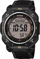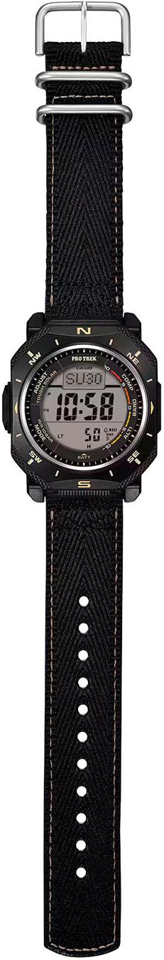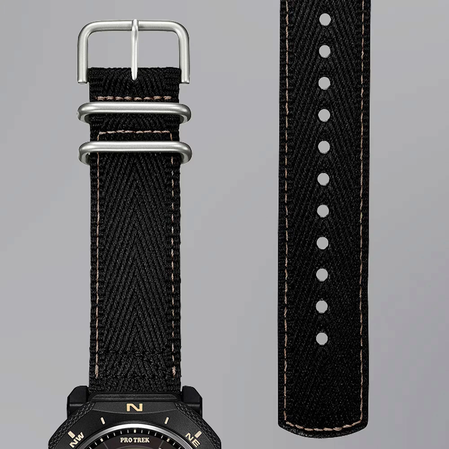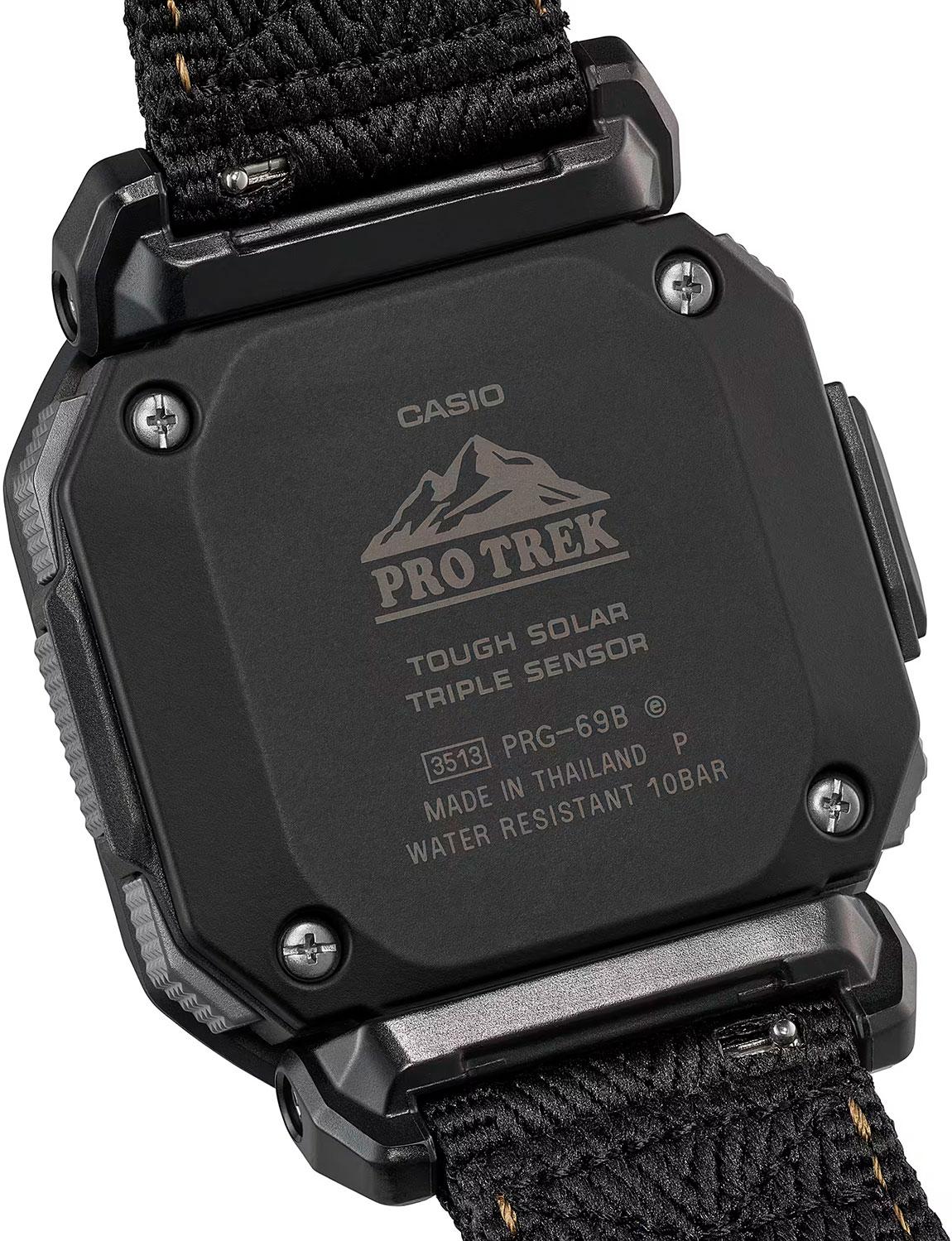 Часы PRG-69B-1 — это профессиональный инструмент для искателей приключений. Использование биопластика в производстве корпуса подчеркивает заботу бренда об окружающей среде без ущерба для прочности. Тканевый ремешок изготовлен из переработанных пластиковых бутылок. Корпус устройства выполнен из огнестойкой биосмолы, сертифицированной по стандарту UL94 (класс V-0), что гарантирует самозатухание материала при удалении источника возгорания. Циферблат часов защищает фактурный безель с румбами (направляющими сторон света) и минеральное стекло.