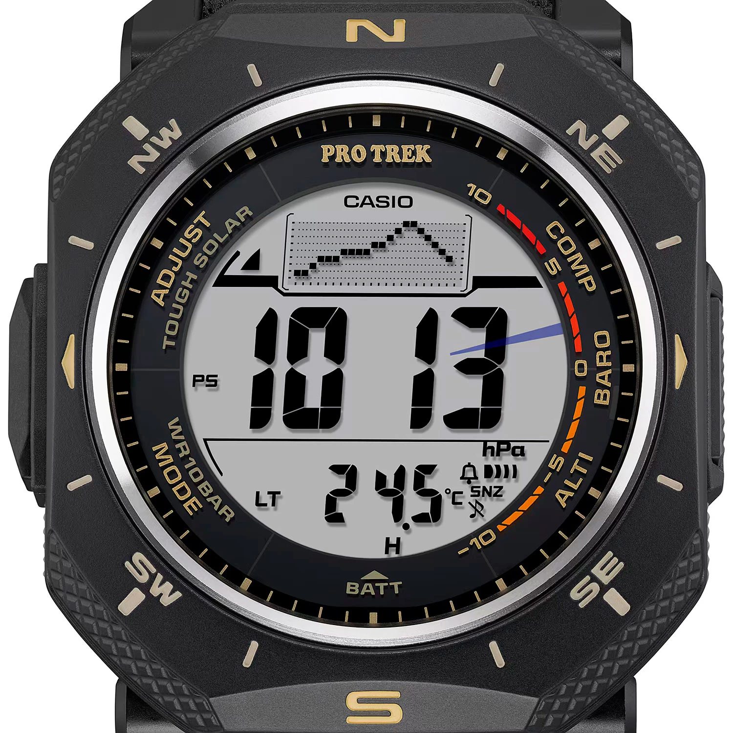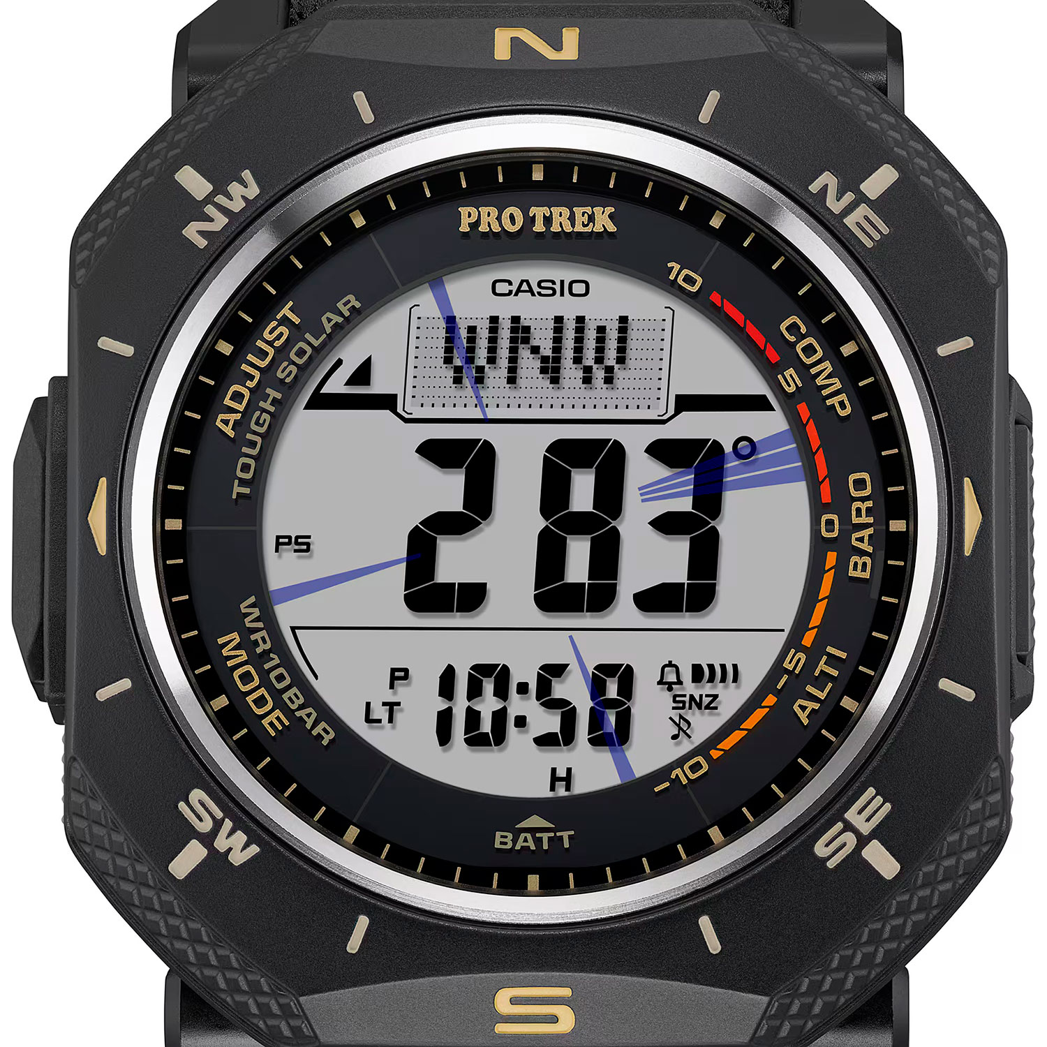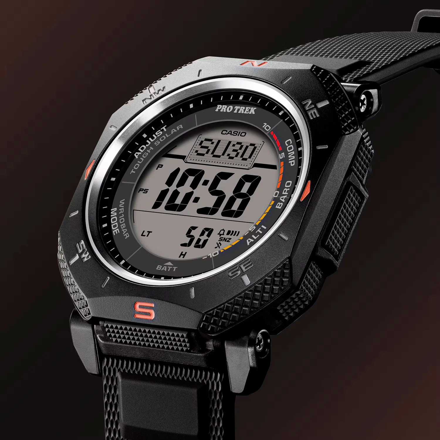 Главное преимущество модели — система Tough Solar, которая заряжает аккумулятор от источника света. Контролировать запас энергии помогает встроенный индикатор уровня заряда. За навигацию отвечает фирменный Triple Sensor: цифровой компас, альтиметр (до 10 000 м) с памятью данных, барометр для прогнозирования погоды и термометр. Для планирования маршрута предусмотрена функция отображения времени восхода и захода солнца, а мировое время в 48 городах делает модель удобной для дальних путешествий. Высокоточный секундомер с шагом 1/10 секунды и пределом измерения до 1000 часов, а также 24-часовой таймер позволяют четко контролировать время. Система из 5 независимых будильников и функция ежечасного сигнала помогут не пропустить важные события. Модель адаптирована к суровым условиям: сохраняет работоспособность при низких температурах до –10°C и обладает водозащитой 10 бар. Это надежный, автономный и функциональный спутник для тех, кто привык полагаться на точные приборы в любой точке мира.