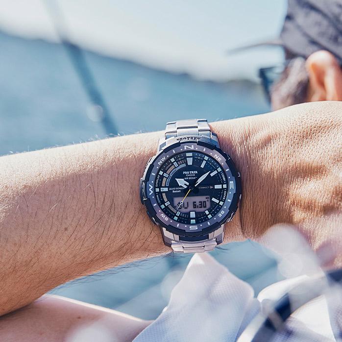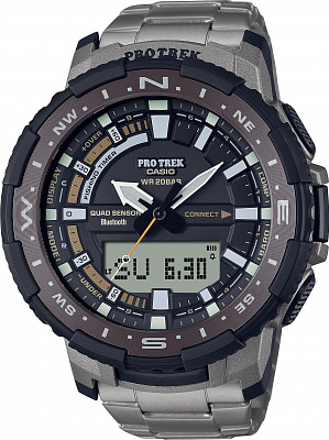 Мужские наручные часы Casio ProTrek PRT-B70T-7E. Точный кварцевый механизм с аналого-цифровой индикацией. Полимерный корпус надежно защищает часы от механических повреждений. Светодиодная подсветка. На циферблате отображается текущее число, месяц и день недели. Ударопрочная конструкция часов защищает от ударов и вибрации. Встроенный цифровой компас определяет северный магнитный полюс. Термометр. Датчик измеряет температуру окружающего воздуха вокруг часов и отображает ее на экране в градусах. Функция Bluetooth позволяет удобно отображать все метрики с часов на экране смартфона, а также выводить на часы уведомления о входящих звонках, сообщениях и имейлах. Высотомер (альтиметр). Встроенный датчик давления определяет изменения в атмосферном давлении и преобразовывает полученные результаты в абсолютную высоту. Специальный датчик измеряет давление воздуха и отображает измеренное значение на экране в виде символа. Это дает возможность заранее определить изменения погоды. Отображение фаз Луны. Часы определяют возраст Луны в текущий момент для текущего местоположения. Функция хронографа. Для подсветки дисплея используется светодиод, а так же имеет функцию автоматического включения подсветки, если Вы наклоните часы к своему лицу. Функция будильника. Аккумулятор обеспечивает часы достаточным питанием приблизительно на 2 года. Отображение текущего времени в основных городах и конкретных областях по всему миру. После настройки автоматический календарь всегда отображает точную дату. Отображение времени возможно в 12-часовом или 24-часовом формате. Титановый браслет. Прочное, устойчивое к царапинам минеральное стекло защищает часы от повреждений.Часы являются водонепроницаемыми до 20 Бар. Цвет корпуса: Черный. Цвет циферблата: Черный. Ширина (с заводной головкой): 51мм. Толщина: 17мм. Гарантия: 2 года. Другие наименования модели: PRT-B70T-7, PRT-B70T-7DR.