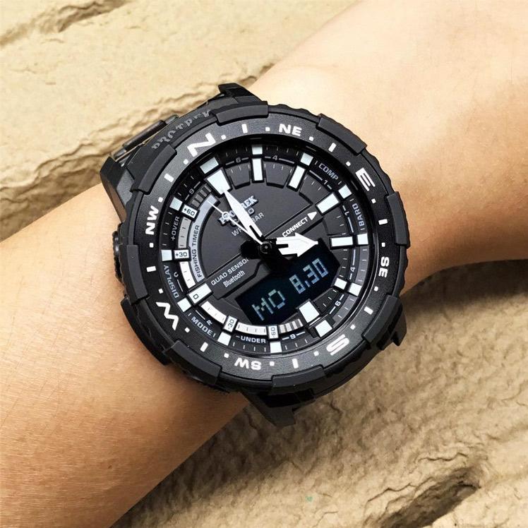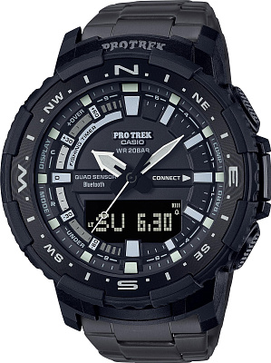 Мужские наручные часы Casio ProTrek PRT-B70YT-1E. Точный кварцевый механизм с аналого-цифровой индикацией. Полимерный корпус надежно защищает часы от механических повреждений. Светодиодная подсветка. На циферблате отображается текущее число, месяц и день недели. Ударопрочная конструкция часов защищает от ударов и вибрации. Встроенный цифровой компас определяет северный магнитный полюс. Термометр. Датчик измеряет температуру окружающего воздуха вокруг часов и отображает ее на экране в градусах. Функция Bluetooth позволяет удобно отображать все метрики с часов на экране смартфона, а также выводить на часы уведомления о входящих звонках, сообщениях и имейлах. Высотомер (альтиметр). Встроенный датчик давления определяет изменения в атмосферном давлении и преобразовывает полученные результаты в абсолютную высоту. Специальный датчик измеряет давление воздуха и отображает измеренное значение на экране в виде символа. Это дает возможность заранее определить изменения погоды. Отображение фаз Луны. Часы определяют возраст Луны в текущий момент для текущего местоположения. Функция хронографа. Функция таймера. Таймеры обратного отсчета напомнят Вам о текущих или особенных событиях, издав звуковой сигнал в установленное время. Функция будильника. Аккумулятор обеспечивает часы достаточным питанием приблизительно на 2 года. Отображение текущего времени в основных городах и конкретных областях по всему миру. После настройки автоматический календарь всегда отображает точную дату. Отображение времени возможно в 12-часовом или 24-часовом формате. Браслет из нержавеющей стали. Прочное, устойчивое к царапинам минеральное стекло защищает часы от повреждений.Часы являются водонепроницаемыми до 20 Бар. Цвет корпуса: Черный. Цвет циферблата: Черный. Ширина (с заводной головкой): 58мм. Толщина: 17мм. Гарантия: 2 года. Другие наименования модели: PRT-B70YT-1, PRT-B70YT-1D, PRT-B70YT-1DR.