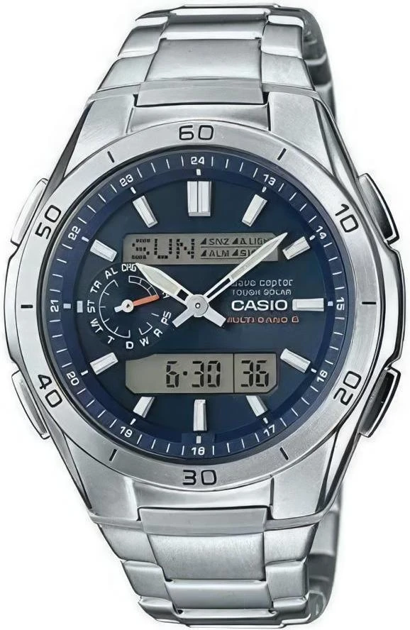 Многофункциональные мужские часы с двойной цифроаналоговой индикацией. Автоматическая подстройка времени по радиосигналу, транслируемому от суперточных эталонных атомных часов. Работа от солнечных батарей. Яркая светодиодная подсветка.