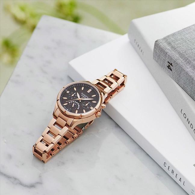 Женские наручные часы со стрелочными указателями даты, дня недели и 24-х часового формата времени. Корпус выполнен из нержавеющей стали со стойким PVD покрытием, на браслете.