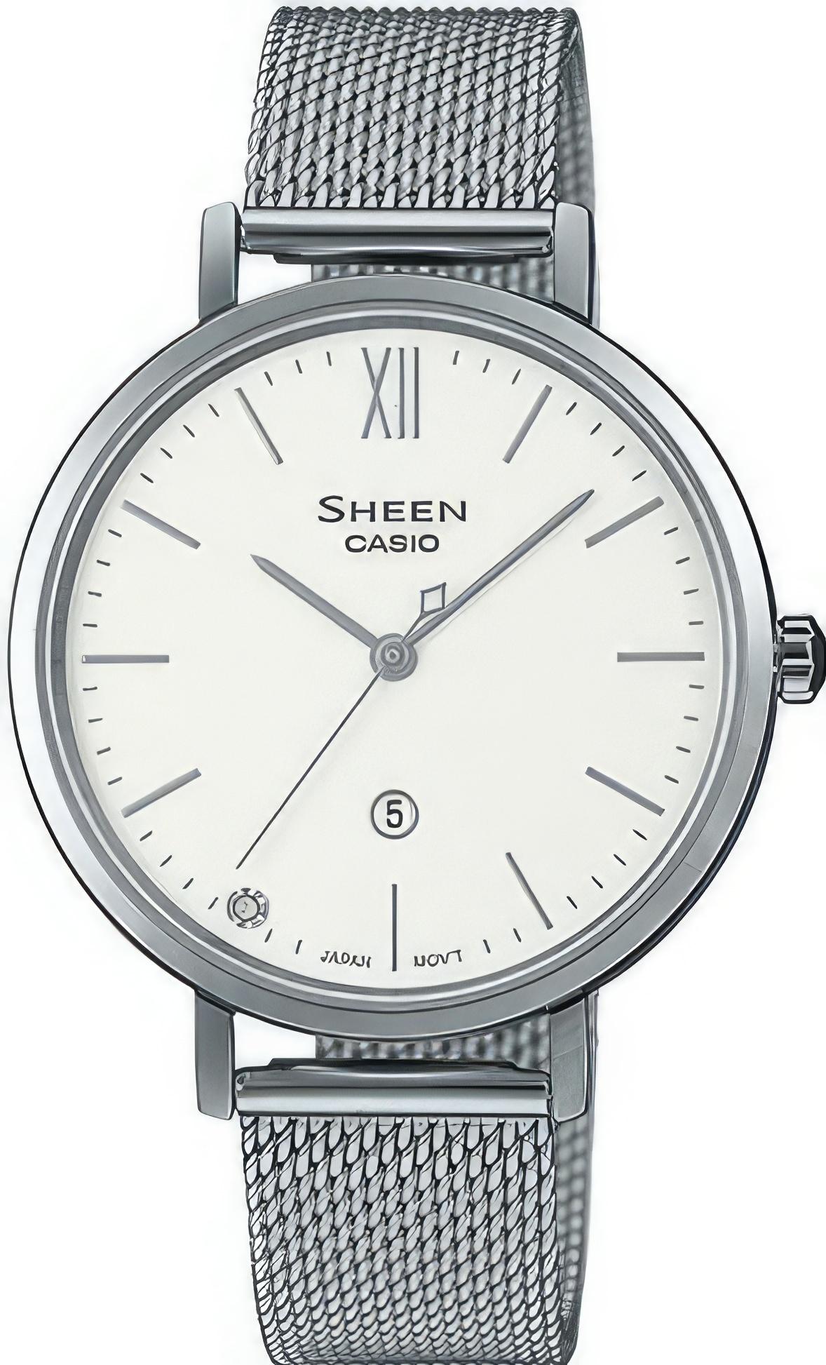 Женские наручные часы Casio Sheen SHE-4539M-7A. Точный кварцевый механизм с аналоговой индикацией. Корпус изготовлен из высококачественной нержавеющей стали 316L с высокими антикоррозийными свойствами. На циферблате отображается текущее число месяца. Браслет из нержавеющей стали. Сапфировое стекло. Искусственно изготовленное стекло с высокой прочностью и устойчивостью к царапинам. Часы являются водонепроницаемыми до 5 Бар. Цвет корпуса: Серебристый. Цвет циферблата: Белый. Гарантия: 2 года.