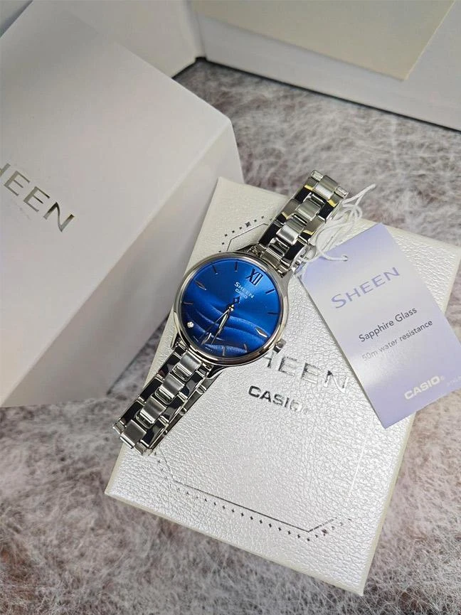 Женские наручные часы Casio Sheen SHE-4550D-2B. Точный кварцевый механизм с аналоговой индикацией. Корпус изготовлен из высококачественной нержавеющей стали 316L с высокими антикоррозийными свойствами. На стрелки и отметки нанесен светонакопительный состав, благодаря этому считывать информацию с циферблата возможно и в темноте. Аккумулятор обеспечивает часы достаточным питанием приблизительно на 3 года. Браслет из нержавеющей стали. Сапфировое стекло. Искусственно изготовленное стекло с высокой прочностью и устойчивостью к царапинам. Часы являются водонепроницаемыми до 5 Бар. Цвет корпуса: Серебристый. Цвет циферблата: Синий. Ширина (с заводной головкой): 38мм. Толщина: 8мм. Гарантия: 2 года. Другие наименования модели: SHE-4550D-2BUER.