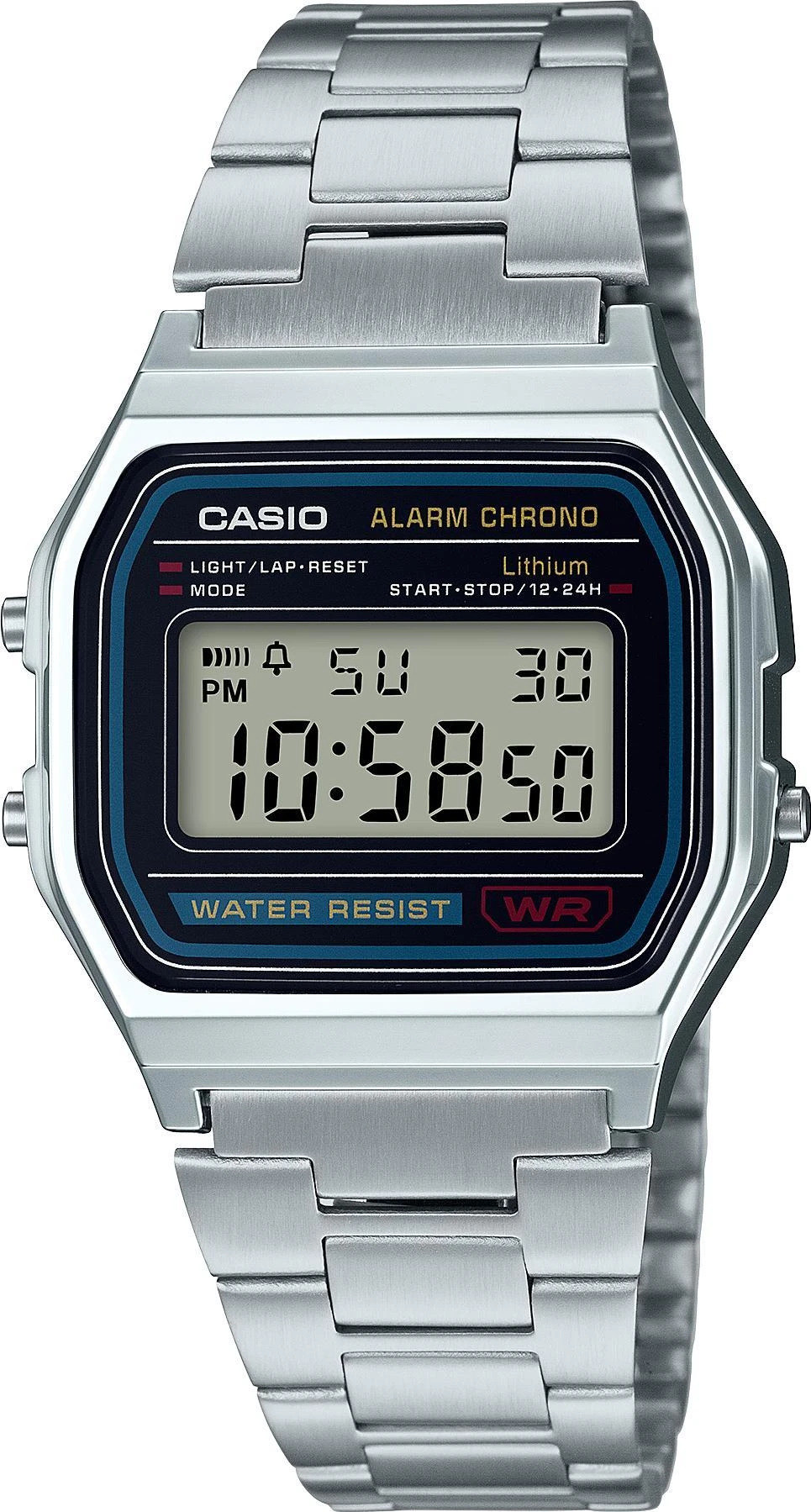 Унисекс часы Casio Vintage A-158WA-1. Точный кварцевый механизм с цифровой индикацей. Точность: ±30 секунд в месяц. Функционал модели ориентирован на максимальное удобство: встроенная светодиодная подсветка гарантирует мгновенное считывание данных при любом освещении, а автоматический календарь после настройки самостоятельно корректирует дату. Для контроля времени предусмотрен высокоточный секундомер с шагом 1/100 секунды и пределом измерения до одного часа, поддерживающий режимы SPLIT и фиксации результатов первого и второго мест. Ежедневный будильник дополнен функцией ежечасного сигнала, помогая структурировать день, а возможность переключения между 12- и 24-часовым форматами позволяет настроить индикацию под личные привычки. Надежность электроники дополнена практичностью корпуса: легкий полимер с хромированным покрытием дополнен браслетом из нержавеющей стали с удобной защелкой, позволяющей самостоятельно регулировать длину, а базовая водонепроницаемость надежно защищает механизм от случайных брызг. Аккумулятор обеспечивает часы достаточным питанием приблизительно на 7 лет. Органическое стекло. Цвет корпуса: Серебристый. Цвет циферблата: Черный. Высота: 36.8 мм. Ширина: 33.2 мм. Толщина: 8.2 мм. Гарантия: 2 года. Другие наименования модели: A-158WA-1D, A158WA-1D, A158WA-1DF, A158WA-1, A-158WA-1E, A158WA-1E.
