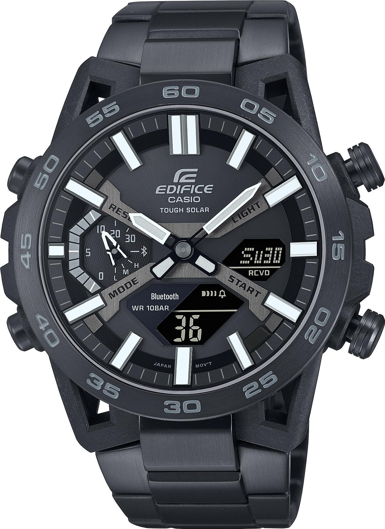 Мужские наручные часы Casio Edifice ECB-2000DC-1B. Точный кварцевый механизм с аналого-цифровой индикацией. Корпус изготовлен из высококачественной нержавеющей стали 316L с высокими антикоррозийными свойствами. Светодиодная подсветка. На циферблате отображается текущее число, месяц и день недели. Автоматический календарь. Авто подсветка. Bluetooth. Будильник. Хронограф. Мировое время. Перемещение стрелок. Солнечная батарея. Таймер. 12/24-часовое отображение времени. Браслет из нержавеющей стали. Прочное, устойчивое к царапинам минеральное стекло защищает часы от повреждений. Часы являются водонепроницаемыми до 10 Бар. Цвет корпуса: Черный. Цвет циферблата: Черный. Ширина (с заводной головкой): 48мм. Толщина: 11мм. Гарантия: 2 года. Другие наименования модели: ECB-2000DC-1BDF, ECB-2000DC-1BVD.