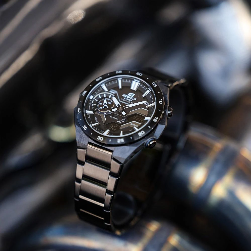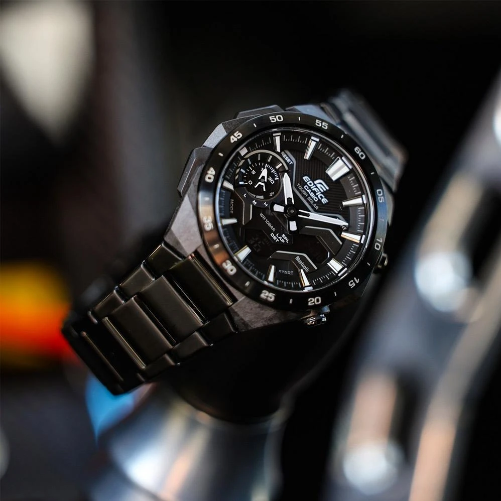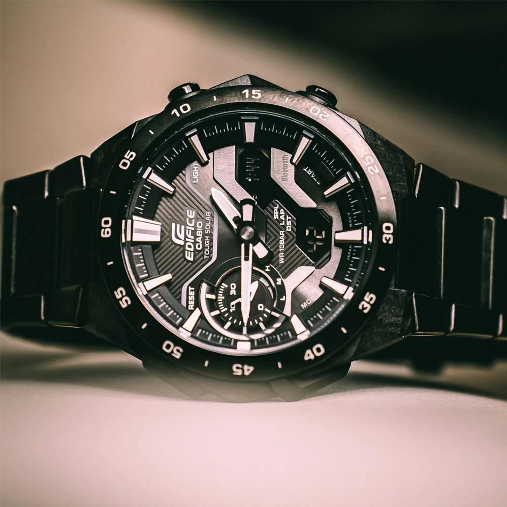 Мужские наручные часы Casio Edifice ECB-2200DC-1A. Точный кварцевый механизм с аналоговой индикацией. Браслет из нержавеющей стали. После настройки автоматический календарь всегда отображает точную дату. Автоматическая корректировака времени. Для подсветки дисплея используется светодиод, а так же имеет функцию автоматического включения подсветки, если Вы наклоните часы к своему лицу. Функция Bluetooth позволяет удобно отображать все метрики с часов на экране смартфона, а также выводить на часы уведомления о входящих звонках, сообщениях и имейлах. Функция будильника. Ежечасный сигнал. Функция хронографа. Индикатор запаса хода. Отображение текущего времени в основных городах и конкретных областях по всему миру. Функция перемещения стрелок. Нажатие на кнопку обеспечит перемещение стрелок в такое положение, которое позволит Вам легко считать информацию с маленьких цифровых дисплеев – например, дату или показатели секундомера. Функция таймера. Таймеры обратного отсчета напомнят Вам о текущих или особенных событиях, издав звуковой сигнал в установленное время. Данные о восходе/закате солнца. После введения географического местоположения, на экране будет отображаться восход и закат солнца для любой установленной даты. Отображение времени возможно в 12-часовом или 24-часовом формате. Карбоновый браслет. Прочное, устойчивое к царапинам минеральное стекло защищает часы от повреждений. На циферблате отображается текущее число, месяц и день недели. Часы являются водонепроницаемыми до 10 Бар. Цвет циферблата: Черный. Цвет корпуса: Черный. Светодиодная подсветка. Толщина: 12 мм. Гарантия: 2 года.