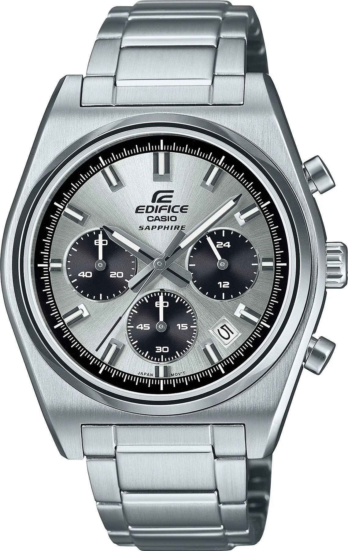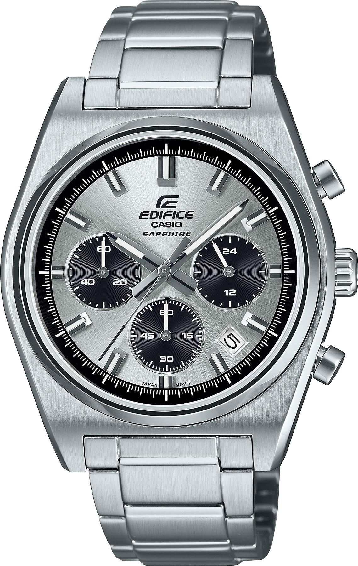 Хронограф Edifice - эталон идеальных повседневных мужских часов. Edifice. Часы-хронограф с секундомером с точностью показаний 1с и временем измерения 1ч. 12-ти и 24-х часовой формат времени. Циферблат с метками в виде штрихов выполнен по технологии Sunray (солнечные лучи) и защищен прочным сапфировым стеклом. Окошко даты находится между метками 4 и 5 часов. Задняя крышка с винтовым фиксатором. Батарейка рассчитана на 3 года. Браслет с тройной раскладывающейся застежкой, расстегиваемой одним касанием.