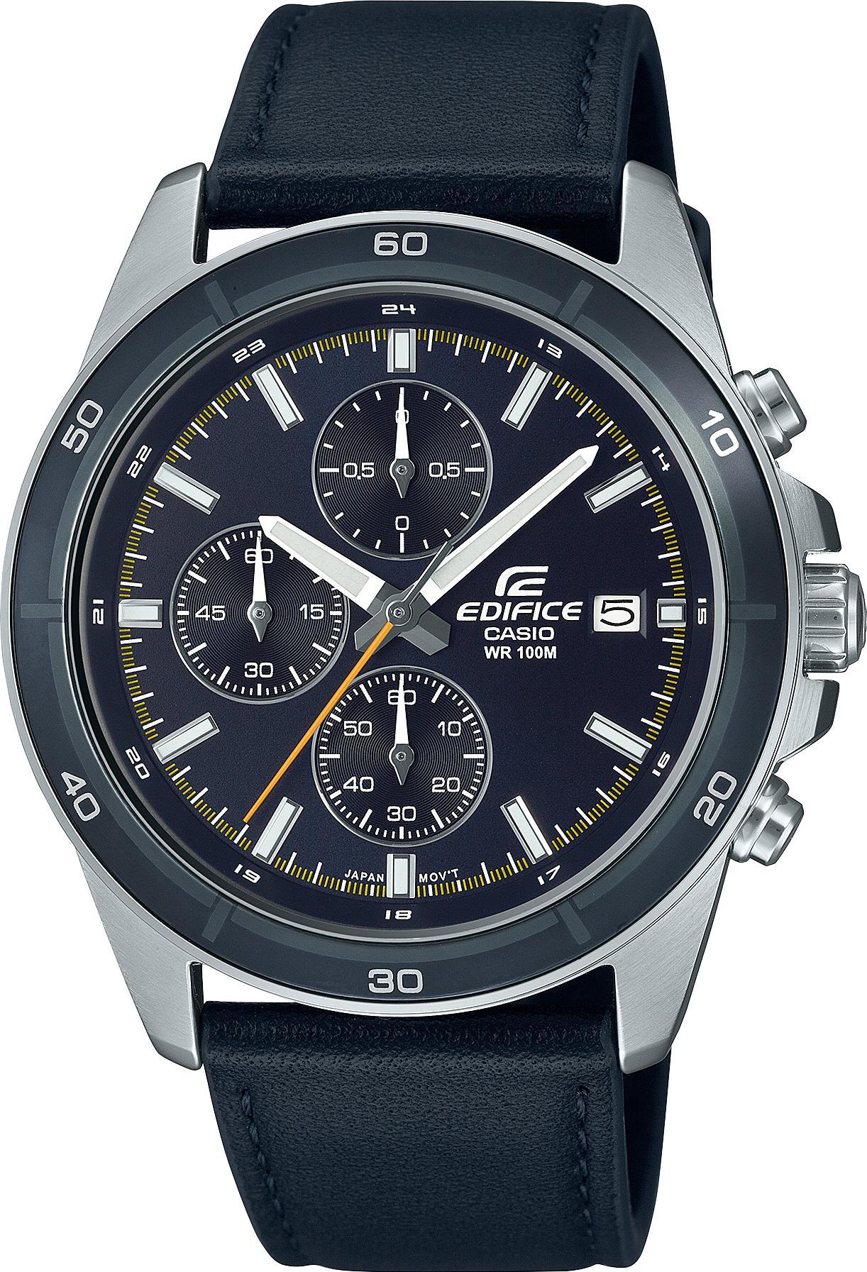 Мужские наручные часы Casio Edifice EFR-526L-2C. Точный кварцевый механизм с аналоговой индикацией. Корпус изготовлен из высококачественной нержавеющей стали 316L с высокими антикоррозийными свойствами. На стрелки и отметки нанесен светонакопительный состав, благодаря этому считывать информацию с циферблата возможно и в темноте. На циферблате отображается текущее число месяца. Ударопрочная конструкция часов защищает от ударов и вибрации. Функция хронографа. Аккумулятор обеспечивает часы достаточным питанием приблизительно на 2 года. Ремешок изготовлен из кожи. Прочное, устойчивое к царапинам минеральное стекло защищает часы от повреждений. Часы являются водонепроницаемыми до 10 Бар. Цвет корпуса: Черный. Цвет циферблата: Черный. Ширина (с заводной головкой): 48мм. Толщина: 12мм. Гарантия: 2 года. Другие наименования модели: EFR-526L-2CVUDF, EFR-526L-2CVUEF.