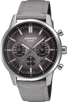 Релиз 2026 года EFR-575 — сферическое стекло и эстетика спорткара! Мужской кварцевый хронограф Casio EFR-575C-8A. Центральные часовая, минутная и секундная стрелки. Апертура даты между 4 и 5 часами. 12/24х часовой формат времени. Секундомер. Градиентный циферблат. Люминесцентное покрытие на стрелках и часовых метках. Круглый корпус выполнен из нержавеющей стали. Серый текстильный ремешок на кожаной подложке, стандартная застежка. Сферическое минеральное стекло, устойчивое к мелким механическим повреждениям. Водостойкость WR 100.