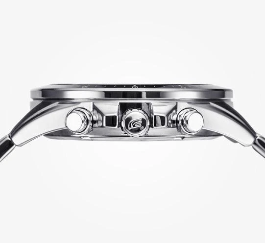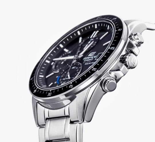 Престижные часы со спортивным дизайном для современных мужчин. Сапфировое стекло. Круглый корпус и браслет из нерж. стали, контрастный безель с разметкой. Японский кварцевый механизм на солнечных батареях с функцией хронографа.
