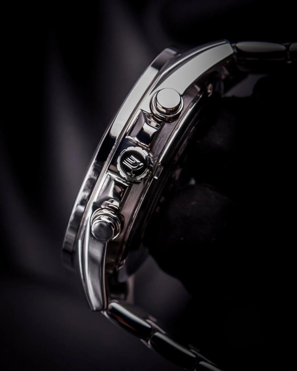 • Безель – контрастный, с черным IP-покрытием и гравированной тахиметрической шкалой.
