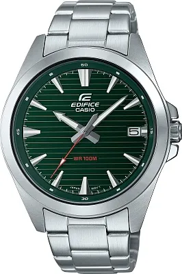 Мужские наручные часы Casio Edifice EFV-140D-1A. Точный кварцевый механизм с аналоговой индикацией. Корпус изготовлен из высококачественной нержавеющей стали 316L с высокими антикоррозийными свойствами. На стрелки нанесен светонакопительный состав, благодаря этому считывать информацию с циферблата возможно и в темноте. На циферблате отображается текущее число месяца. Аккумулятор обеспечивает часы достаточным питанием приблизительно на 3 года. Браслет из нержавеющей стали. Прочное, устойчивое к царапинам минеральное стекло защищает часы от повреждений. Часы являются водонепроницаемыми до 10 Бар. Цвет корпуса: Серебристый. Цвет циферблата: Черный. Ширина (с заводной головкой): 49мм. Толщина: 11мм. Гарантия: 2 года. Другие наименования модели: EFV-140D-1AVUDF, EFV-140D-1AVUEF.