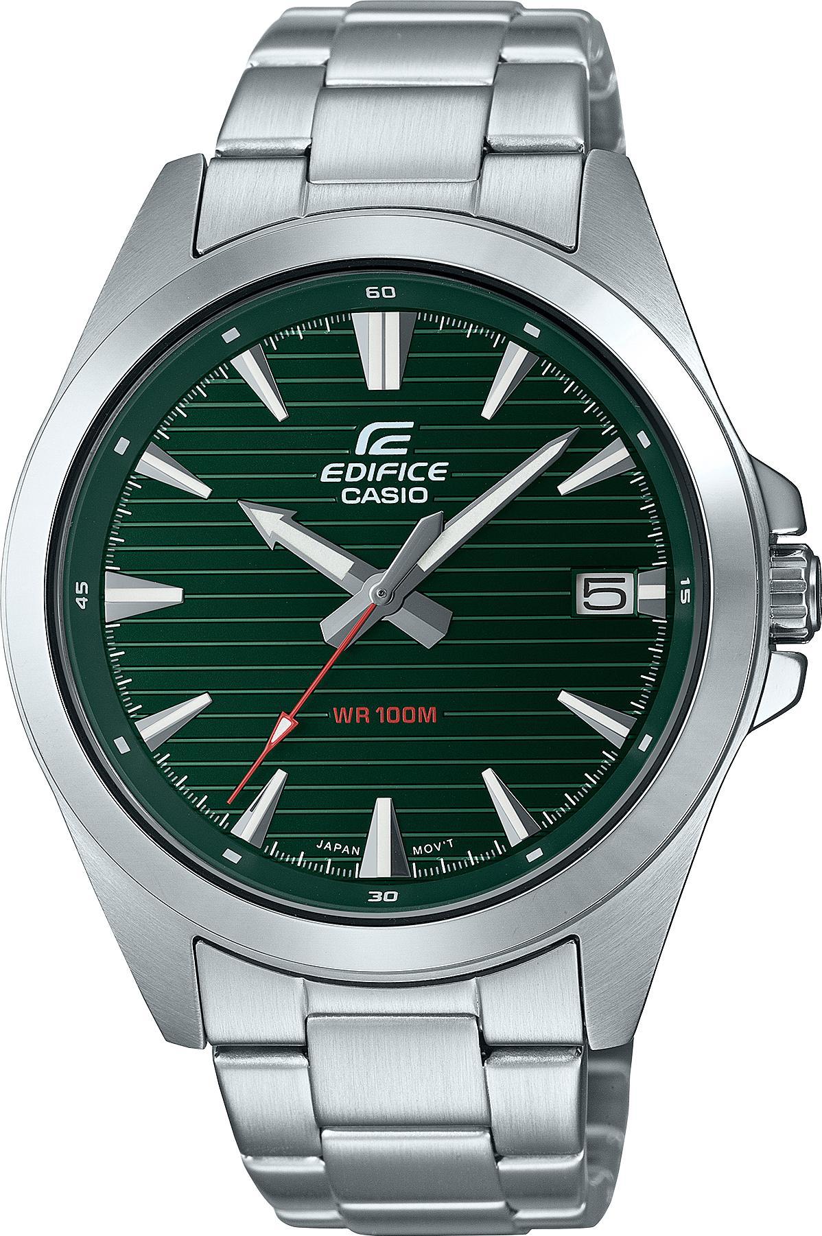 Мужские наручные часы Casio Edifice EFV-140D-3A. Точный кварцевый механизм с аналоговой индикацией. Корпус изготовлен из высококачественной нержавеющей стали 316L с высокими антикоррозийными свойствами. На стрелки и отметки нанесен светонакопительный состав, благодаря этому считывать информацию с циферблата возможно и в темноте. На циферблате отображается текущее число месяца. Аккумулятор обеспечивает часы достаточным питанием приблизительно на 3 года. Браслет из нержавеющей стали. Прочное, устойчивое к царапинам минеральное стекло защищает часы от повреждений. Часы являются водонепроницаемыми до 10 Бар. Цвет корпуса: Серебристый. Цвет циферблата: Зеленый. Ширина (с заводной головкой): 49мм. Толщина: 11мм. Гарантия: 2 года. Другие наименования модели: EFV-140D-3AVUDF.