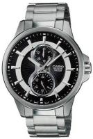 Мужские наручные часы Casio Edifice EFV-140L-7A. Точный кварцевый механизм с аналоговой индикацией. Корпус изготовлен из высококачественной нержавеющей стали 316L с высокими антикоррозийными свойствами. На стрелки и отметки нанесен светонакопительный состав, благодаря этому считывать информацию с циферблата возможно и в темноте. На циферблате отображается текущее число месяца. Аккумулятор обеспечивает часы достаточным питанием приблизительно на 3 года. Ремешок изготовлен из кожи. Прочное, устойчивое к царапинам минеральное стекло защищает часы от повреждений. Часы являются водонепроницаемыми до 10 Бар. Цвет корпуса: Серебристый. Цвет циферблата: Серый. Ширина (с заводной головкой): 49мм. Толщина: 11мм. Гарантия: 2 года. Другие наименования модели: EFV-140L-7AVUDF.
