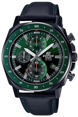 Мужские кварцевые часы из серии Edifice. Стальной круглый корпус с PVD покрытием. Минеральное стекло. Зеленый циферблат. Водозащита 100 м.