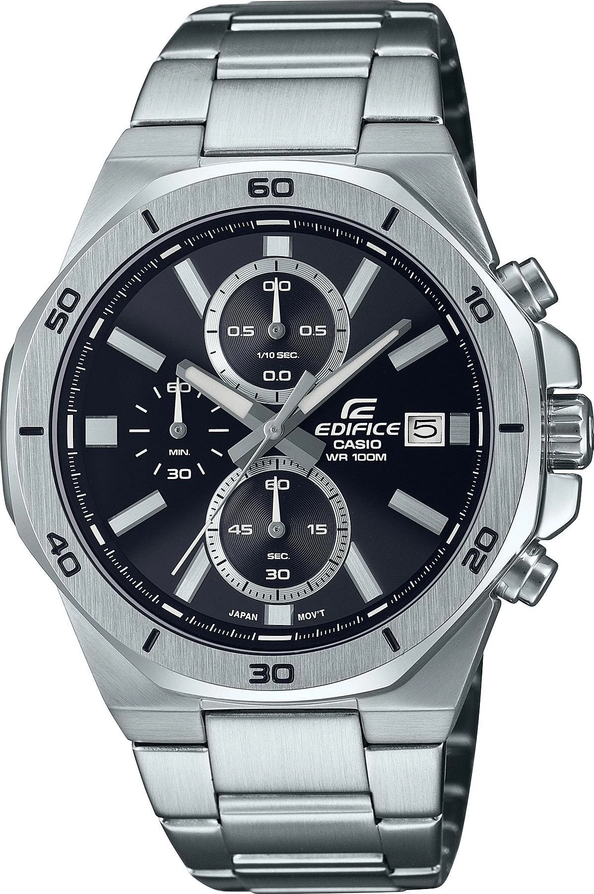 Мужские наручные часы Casio Edifice EFV-640D-1A. Точный кварцевый механизм с аналоговой индикацией. Корпус изготовлен из высококачественной нержавеющей стали 316L с высокими антикоррозийными свойствами. На стрелки и отметки нанесен светонакопительный состав, благодаря этому считывать информацию с циферблата возможно и в темноте. На циферблате отображается текущее число месяца. Функция хронографа. Аккумулятор обеспечивает часы достаточным питанием приблизительно на 2 года. Браслет из нержавеющей стали. Прочное, устойчивое к царапинам минеральное стекло защищает часы от повреждений. Часы являются водонепроницаемыми до 10 Бар. Цвет корпуса: Серебристый. Цвет циферблата: Черный. Ширина (с заводной головкой): 47мм. Толщина: 11мм. Гарантия: 2 года. Другие наименования модели: EFV-640D-1AVUEF, EFV-640D-1AVUDF.