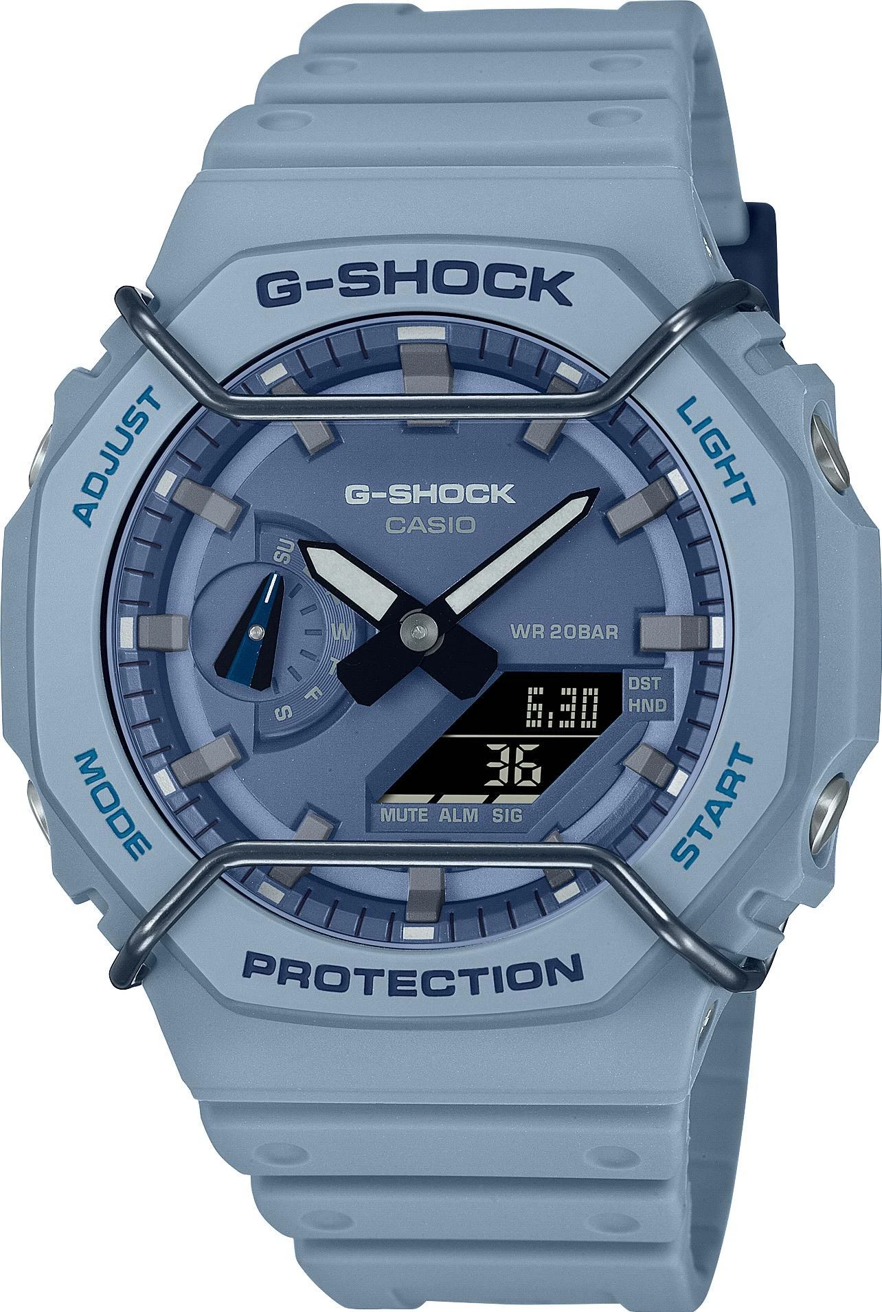 Мужские наручные часы Casio G-Shock GA-2100PT-2A. Точный кварцевый механизм с аналого-цифровой индикацией. Полимерный корпус надежно защищает часы от механических повреждений. Светодиодная подсветка. На циферблате отображается текущее число, месяц и день недели. Ударопрочная конструкция часов защищает от ударов и вибрации. Часы созданы с защитой от воздействия магнитных полей. Функция хронографа. Функция таймера. Таймеры обратного отсчета напомнят Вам о текущих или особенных событиях, издав звуковой сигнал в установленное время. Функция будильника. Аккумулятор обеспечивает часы достаточным питанием приблизительно на 3 года. Отображение текущего времени в основных городах и конкретных областях по всему миру. После настройки автоматический календарь всегда отображает точную дату. Отображение времени возможно в 12-часовом или 24-часовом формате. Полимерный ремешок. Натуральный полимерный материал является идеальным для изготовления ремешка благодаря своей чрезвычайной прочности и гибкости. Прочное, устойчивое к царапинам минеральное стекло защищает часы от повреждений.Часы являются водонепроницаемыми до 20 Бар. Цвет корпуса: Голубой. Цвет циферблата: Синий. Ширина (с заводной головкой): 48мм. Толщина: 13мм. Гарантия: 2 года. Другие наименования модели: GA-2100PT-2ADR.