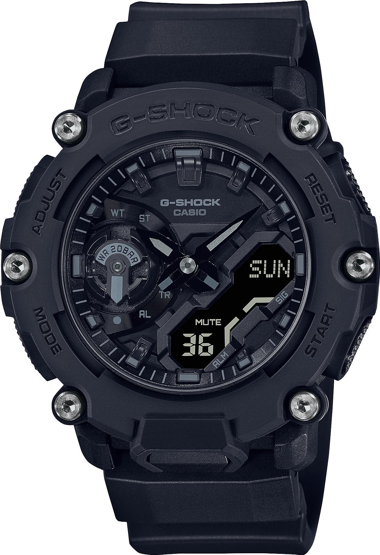 Мужские кварцевые часы с аналого-цифровым вариантом отображения времени из серии G-Shock. Круглый карбоновый корпус черного цвета. Черный циферблат. Минеральное стекло. Водозащита 200 м. Черный пластиковый ремешок с классической пряжкой.