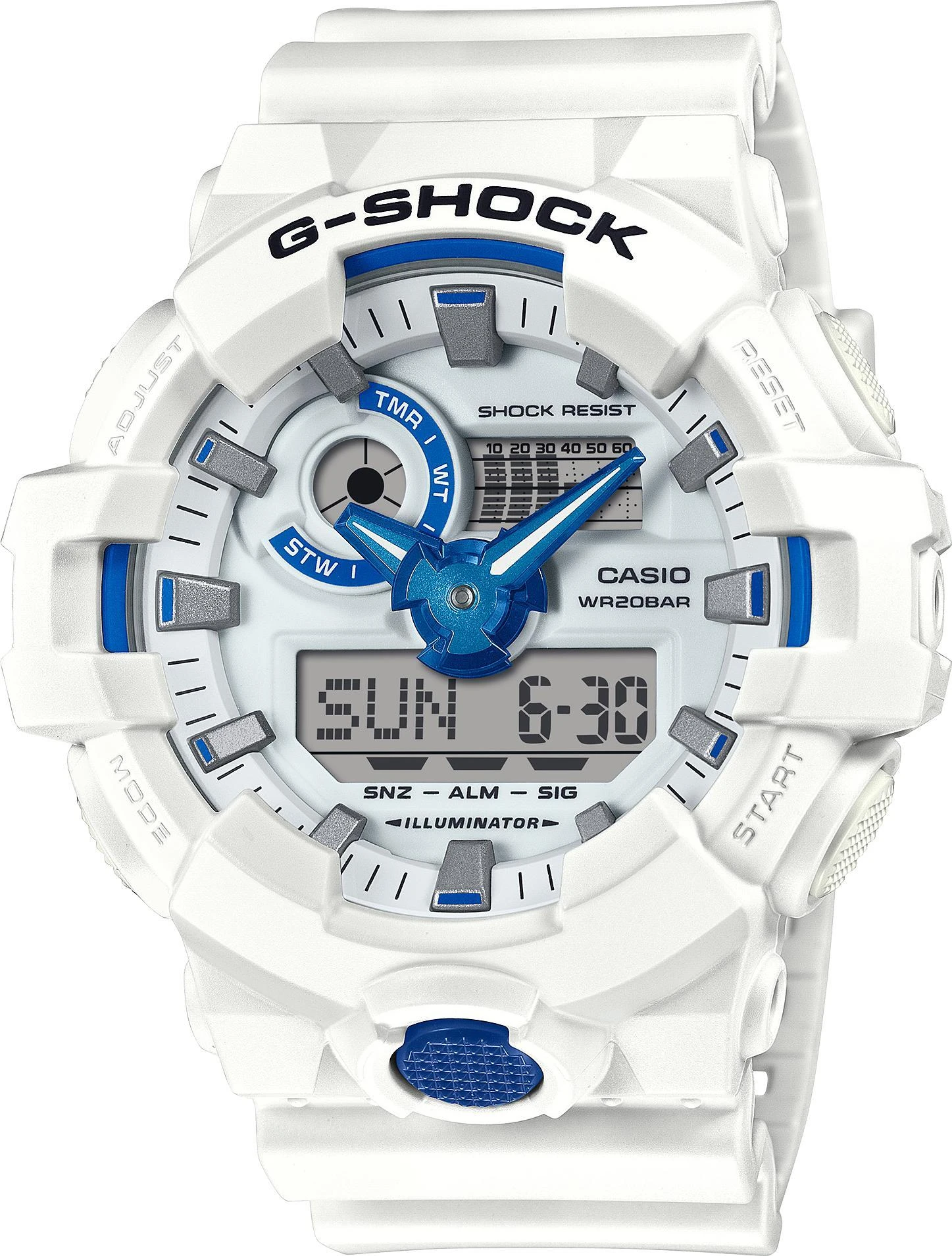 Вдохновение летним морем: бело-голубой G-SHOCK. Часы с фосфоресцирующим голубым циферблатом, который загадочно светится в темноте, напоминая мерцание морского планктона. Сочетание бело-голубой гаммы передает красоту прибрежного пейзажа — от ярких красок дня до мягких вечерних оттенков. Этот морской стиль легко сочетается как с повседневными, так и с деловыми образами, добавляя свежесть и легкость вашему образу.