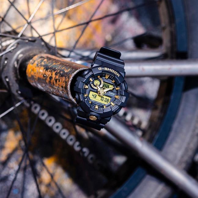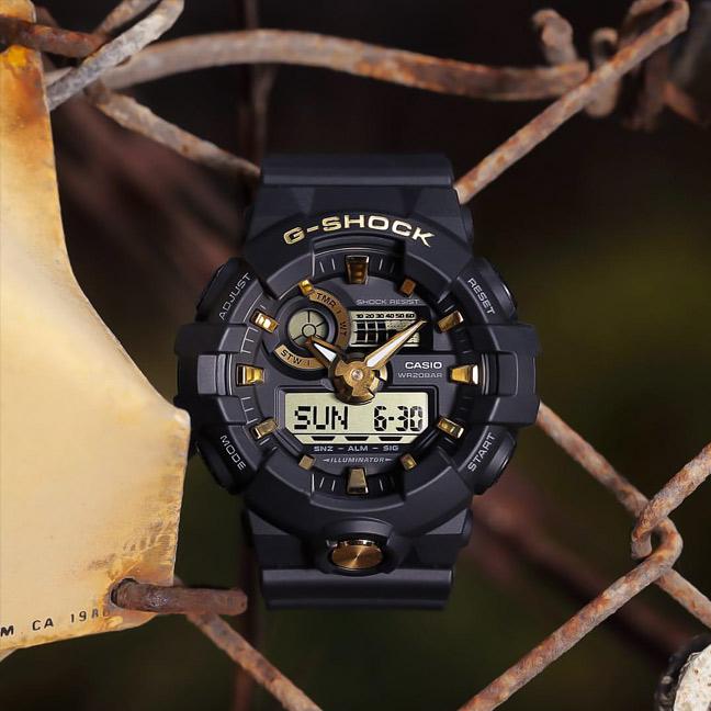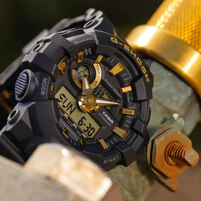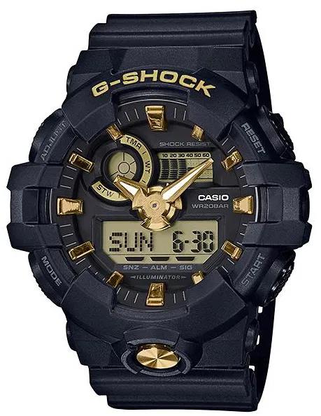 <b>Ударопрочные часы со всеми преимуществами знаменитых G-Shock. Использование в дизайне черно-золотой гаммы. Привычная система управления. Многофункциональный кварцевый механизм с двойной цифроаналоговой индикацией. Срок службы батареи 5 лет</b><br><br>Многофункциональный кварцевый механизм, модуль 5522 с двойной цифро-аналоговой индикацией при помощи многофункциональных стрелок и на жидкокристаллическом дисплее. Точность хода с погрешностью не более +/-15 секунд в месяц. Элемент питания CR2016 рассчитан на 5 лет работы. Функции:<br>• Яркая светодиодная LED-подсветка срабатывает при нажатии на кнопку. Изменяемое время свечения – 1,5 или 3 секунды.<br>• Отображение мирового времени в 31 часовых поясах с отображением 48 основных городов в них + GMT.<br>• Секундомер с точностью показаний 1/100 сек и максимальным временем измерения 24 часа. Режимы измерения – SPLIT и ADD.<br>• Таймер обратного отсчета на 60 минут с точностью в 1 секунду.<br>• 5 ежедневных будильников, устанавливаемых на определенное время, один с функцией Snooze, ежечасный сигнал.<br>• Вкл./Откл. звука кнопок.<br>• Подстройка положения стрелок при нажатии кнопок, таким образом, чтобы не закрывать дисплей и вспомогательные индикаторы.<br>• Автоматический календарь, не требующий дополнительной корректировки, может быть настроен по 2099 год.<br>• Отображение времени в 12/24 часовом формате.<br><br>Особая ударопрочная конструкция корпуса защищает механизм-модуль часов от ударов и вибрации. Технические характеристики:<br>• Комбинированный корпус выполнен из нерж. стали 316L и композитного полимерного материала.<br>• Размеры корпуса 53,4 мм (по оси заводной головки) х 57,5 мм (по вертикали) х 18,4 мм (толщина). Вес приблизительно 69 грамм.<br>• Минеральное стекло устойчивое к возникновению царапин.<br>• Трехмерный циферблат с блестящим металлизированным покрытием больших часовых меток с объемной 3D структурой.<br>• Люминесцентный состав на стрелках и часовых метках с ярким послесвечением даже после кратковременного воздействия света.<br>• Стальная задняя крышка из нерж. стали с гравировкой соединена с корпусом 4 винтами.<br>• Водостойкость на глубине 200 метров (20 АТМ).<br>• Ремешок из полимерного материала, стандартная застежка с двойным шипом.